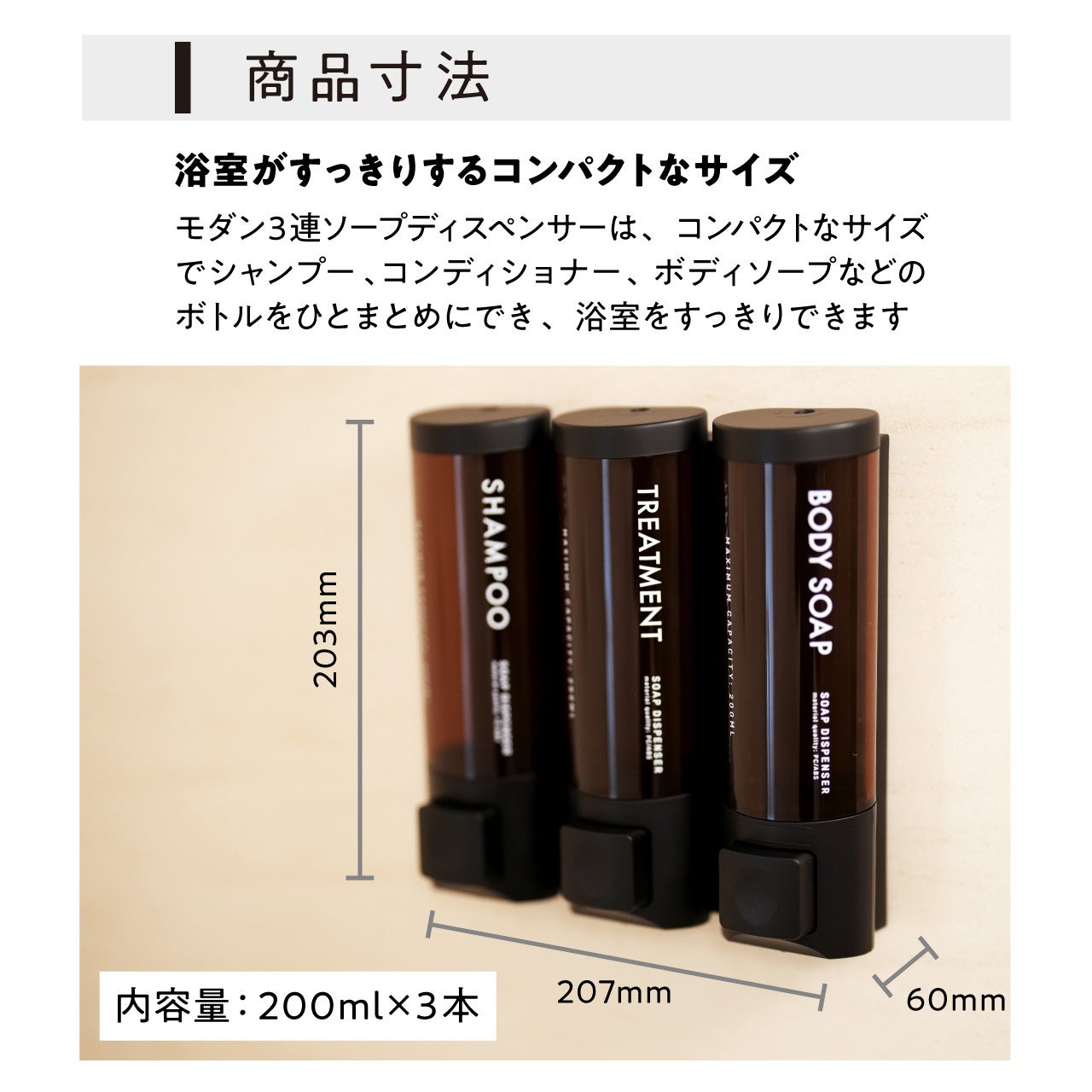 インテリアアートショップが作ったモダンな3連マグネットソープディスペンサー【今話題の壁面収納で、浴室をすっきりさせるコンパクトタイプ】