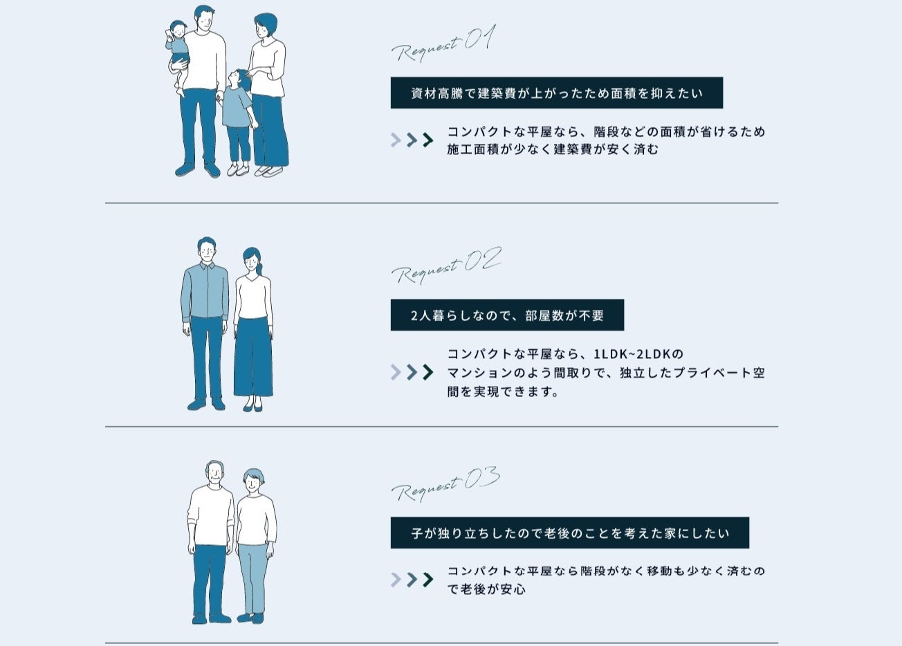 Make House株式会社(本社:東京都港区、代表取締役:眞木健一、以下「Make House」)は、2024年2月1日(木)に住宅事業者向けにデザイン住宅の専門家が監修した今人気の「コンパクトな平屋」プラン集の販売を開始しました。