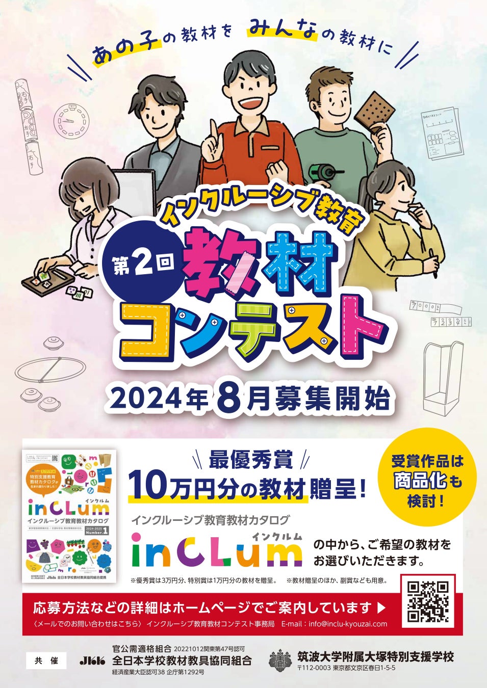 全日本学校教材教具協同組合と筑波大学附属大塚特別支援学校が共催する「インクルーシブ教育教材コンテスト」を開催中です。締切は2024年10月16日。「あの子の教材をみんなの教材に」を合言葉に、審査員によって選出された教材の教材化や、ご応募いただいた皆さまの情報共有を行っています。