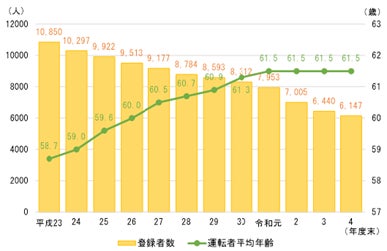 京都市域の法人タクシー運転者の登録数は令和元年度7,953人と令和4年度6,147人を比較すると約2割減少しており、コロナ禍以降担い手不足が深刻化しています。また平成26年(2014年)以降、運転者平均年齢は60歳を超えており、高齢化も進んでいます。