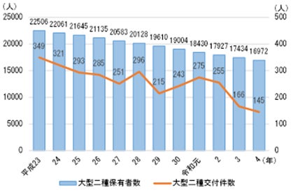 京都府内の大型二種交付件数は令和元年度275人と令和4年度145人で比較するとほぼ半減しており、新たな担い手の確保が大きな課題となっています。また、定年退職者数に比して採用者数が十分でないためバス運転士は常に足りていない状況だと言えます。