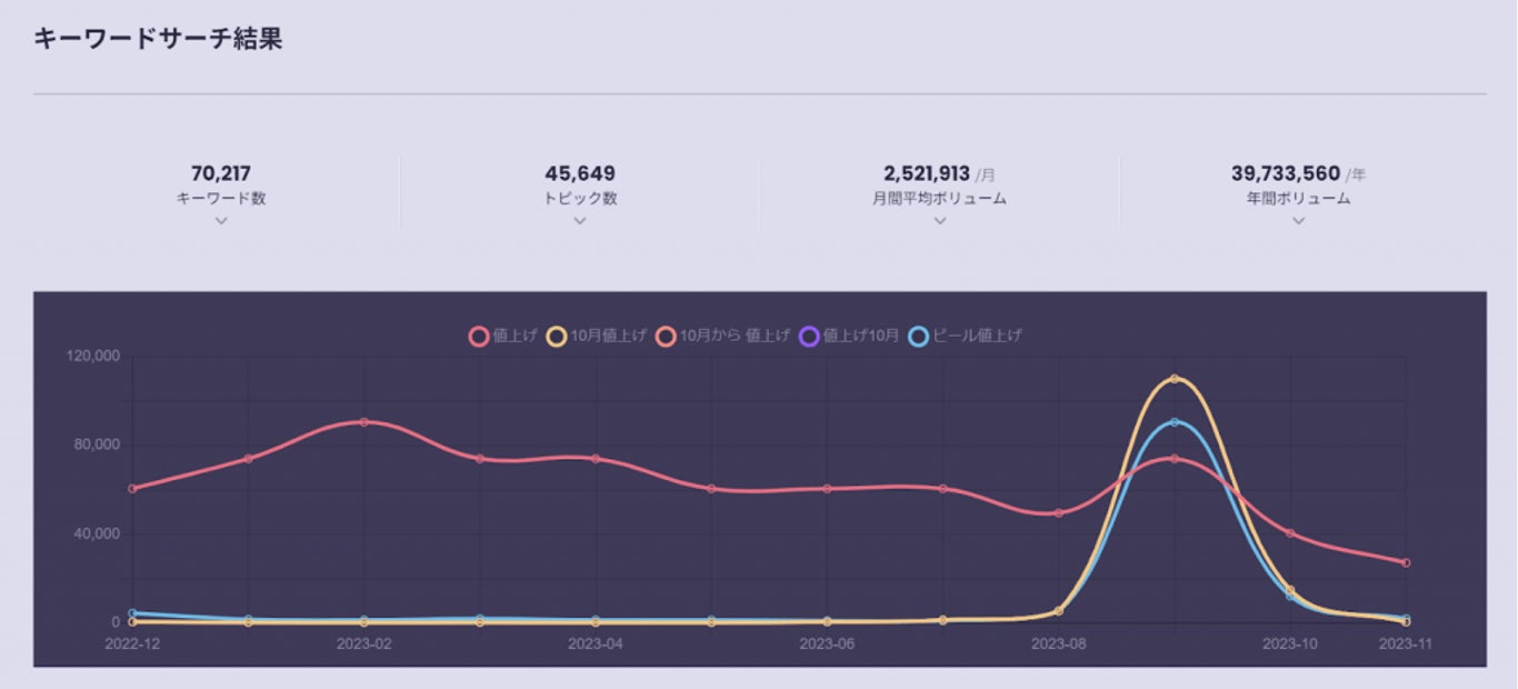 関連する検索キーワードとトレンドを分析可能なListening Mindの「インテントファインダー機能」で‘値上げ’について検索したところ、キーワード数が70,217個 / トピック数が45,649個 / 月間平均ボリューム(直近3ヶ月の平均)が2,521,913と、かなり多く検索されていました。