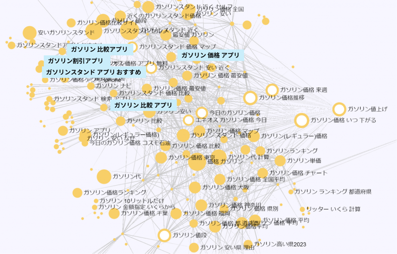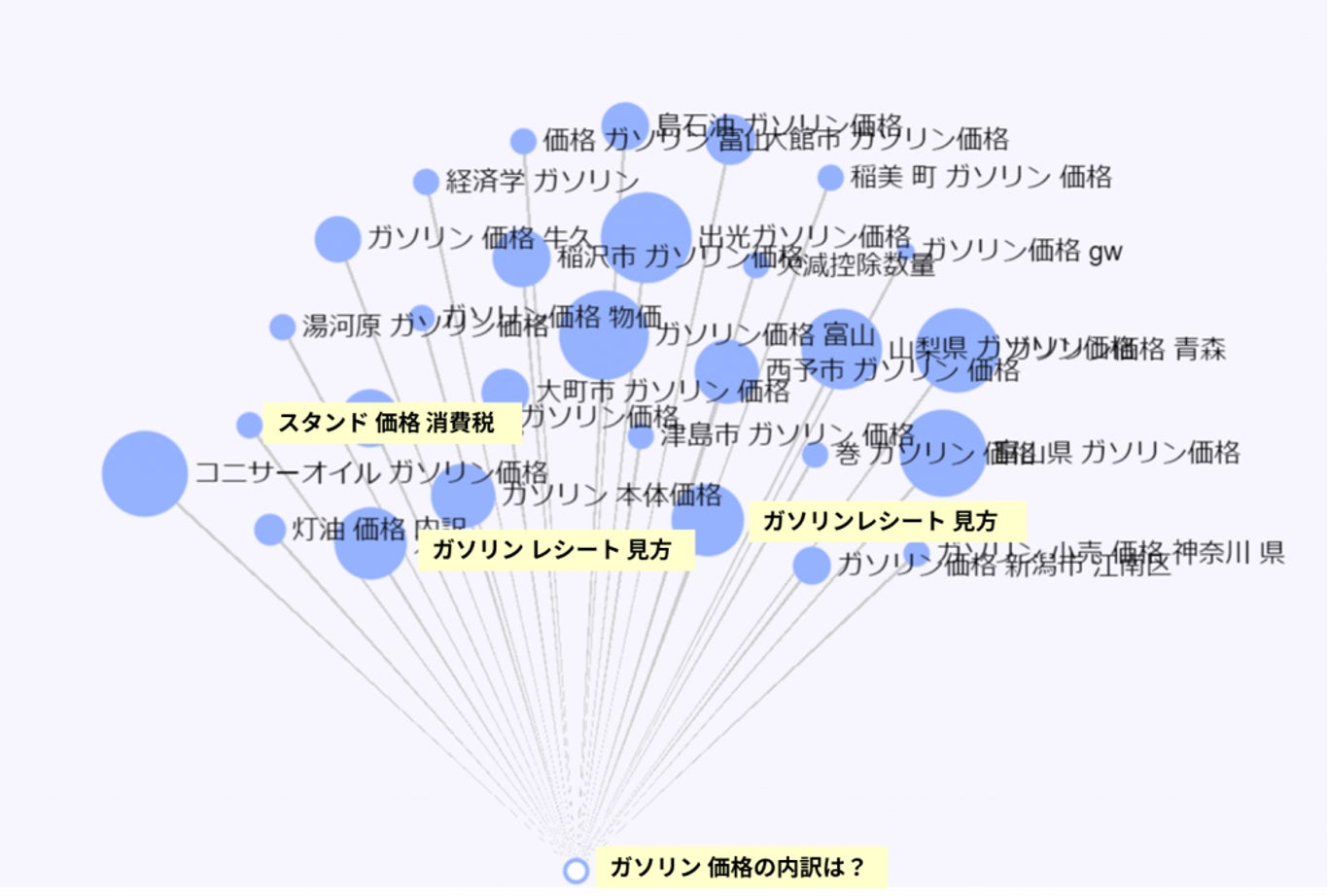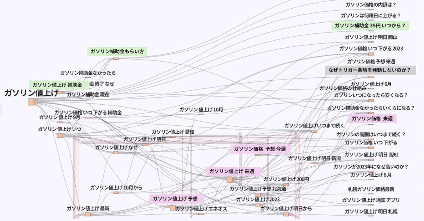 ガソリン値上げ後に、消費者がどのような検索を行い、またどのような行動を行うのかを、次はListening Mindの「パスファインダー機能」で調査したところ、以下に分類されることがわかりました。