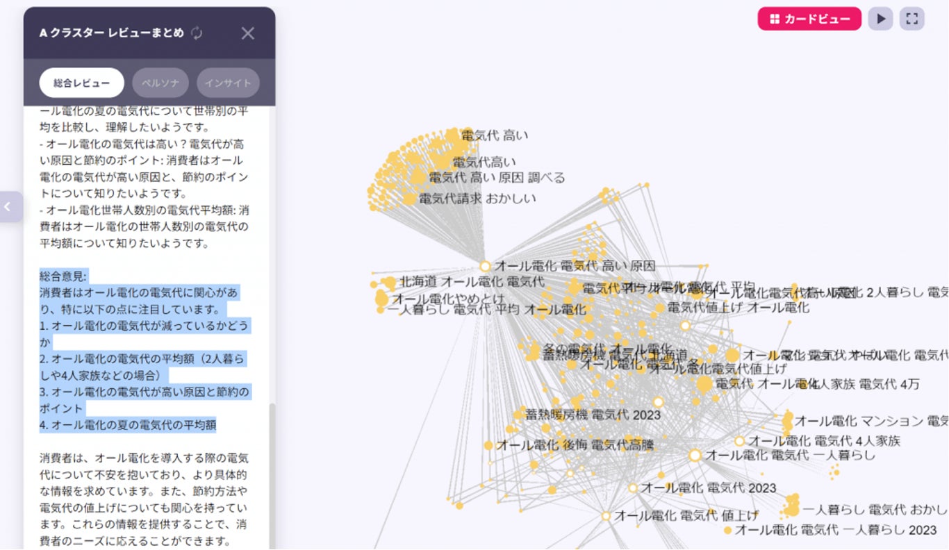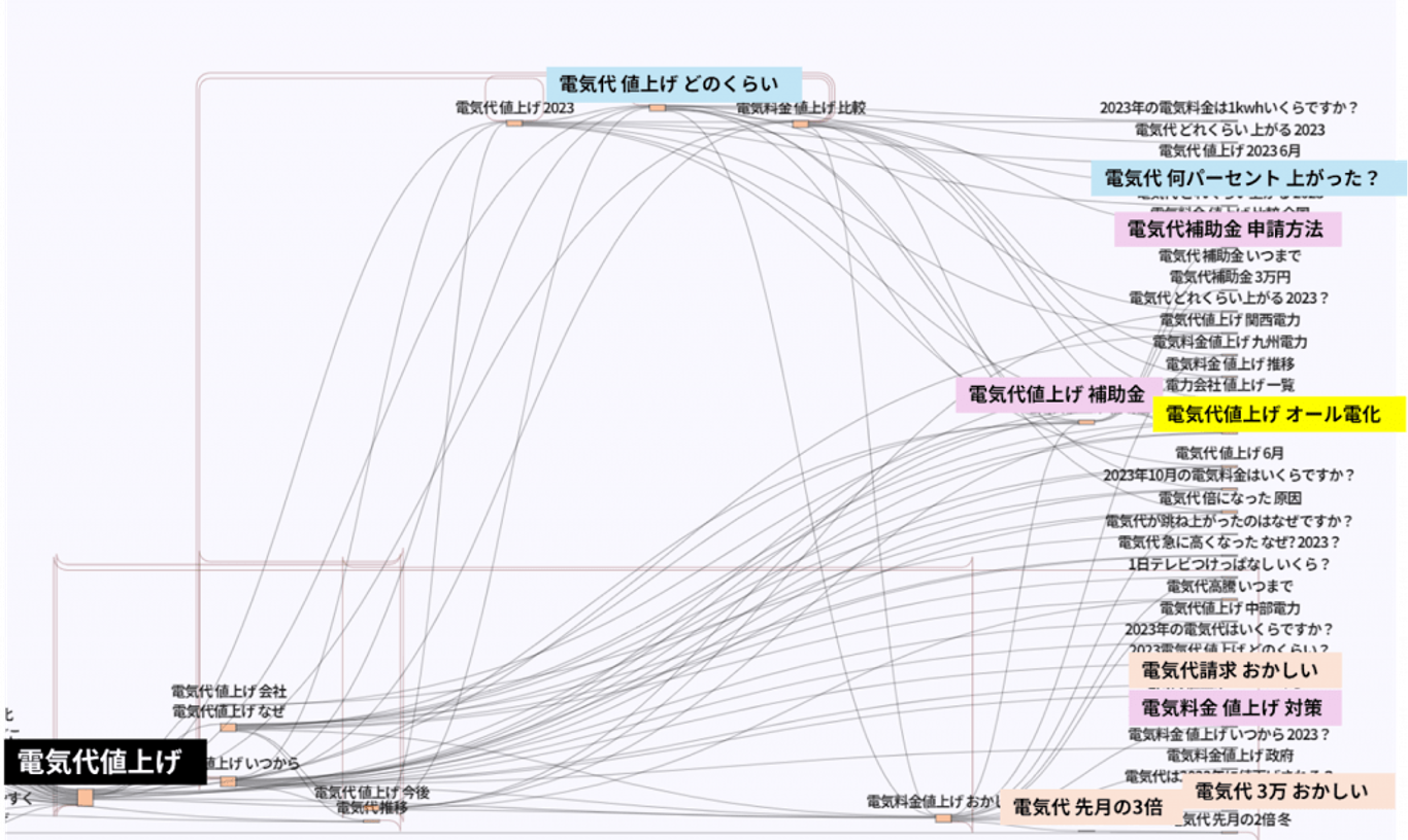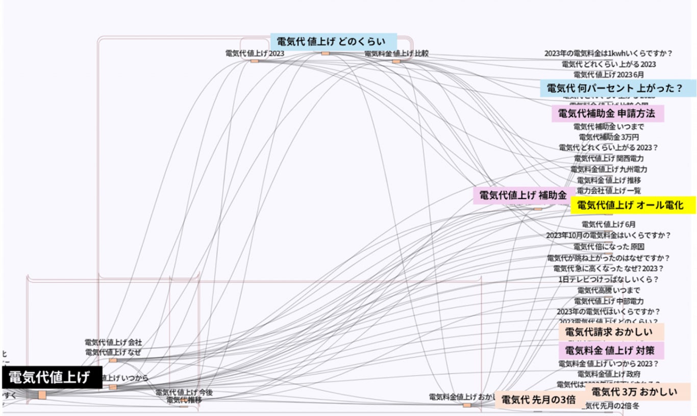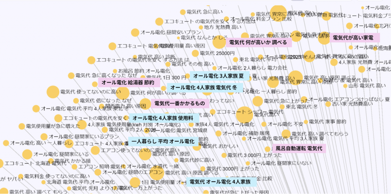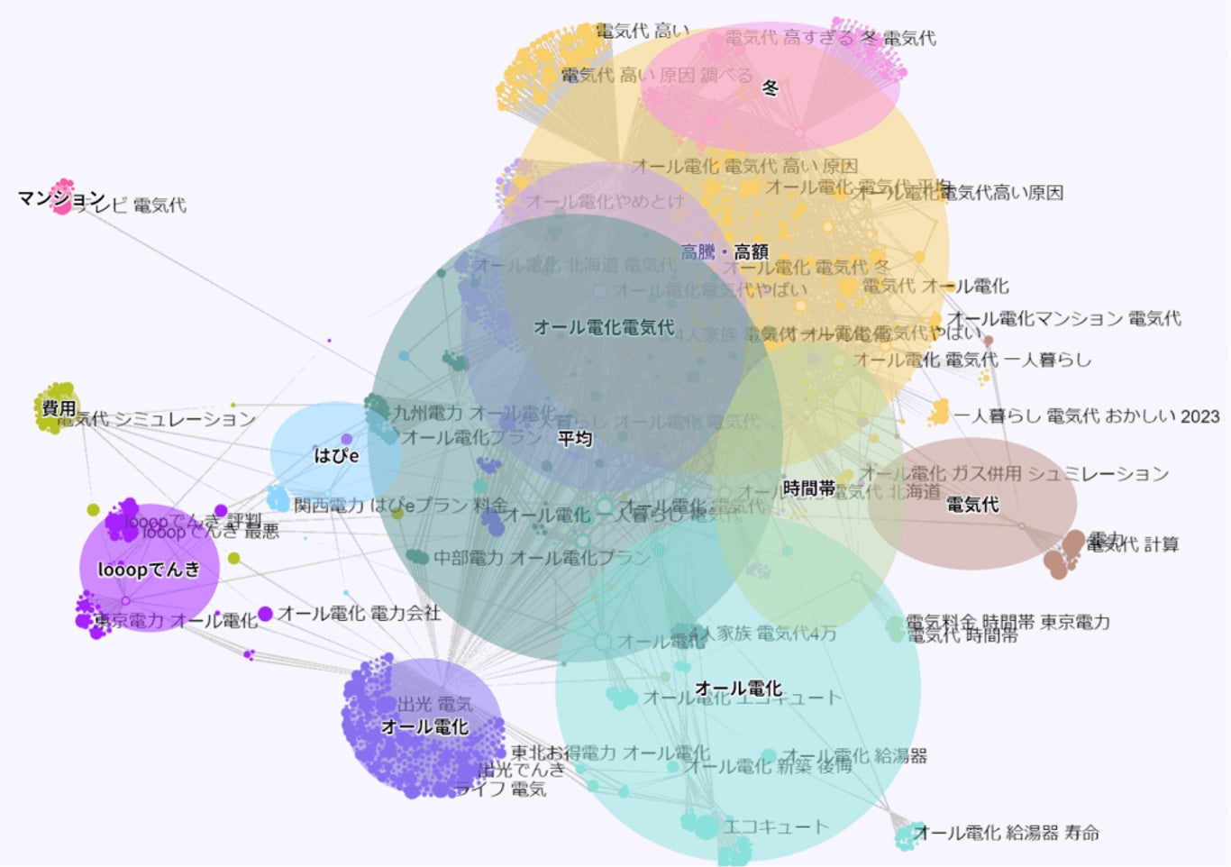 オール電化の商品名のクラスターや、電気代、平均、高騰、冬などのクラスターに分かれました。