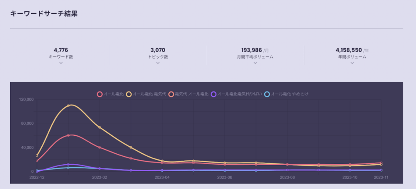 キーワード数が4,776個 / トピック数が 3,070個 / 月間平均ボリューム(直近3ヶ月の平均)が 193,986 / 年間ボリュームが 4,158,550と、多くの検索がされています。