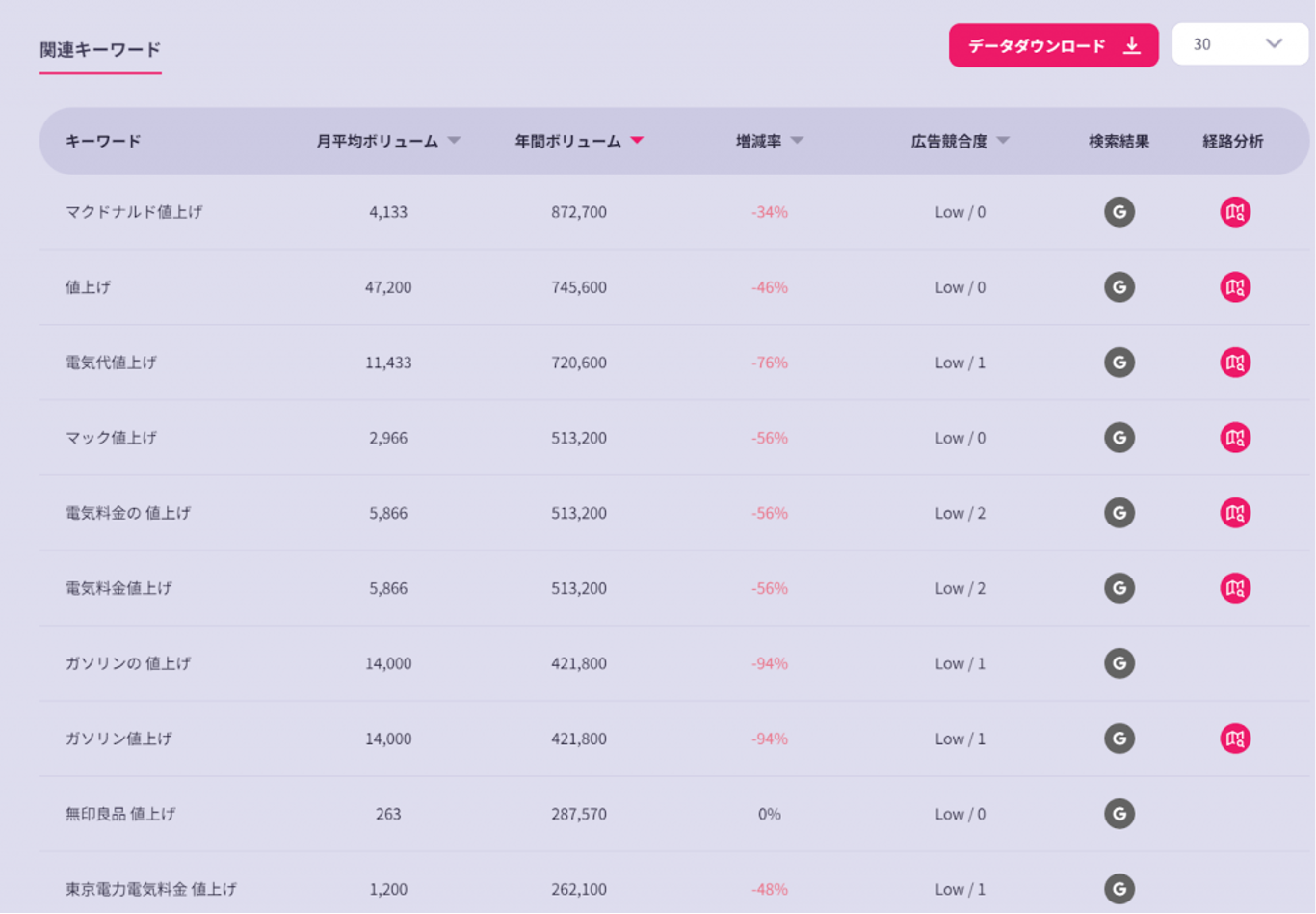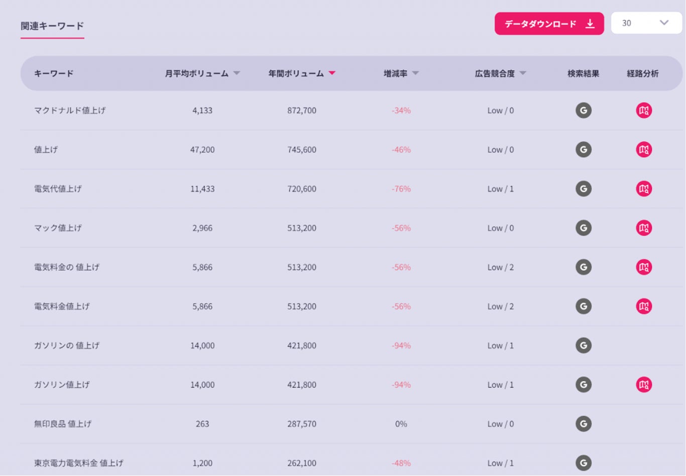 年間ボリューム順に見ると、[マクドナルドの値上げ→電気代→ガソリン代]の順に検索数が多く、値上げの頻度や生活との密接度が検索数に関係していることがわかります。