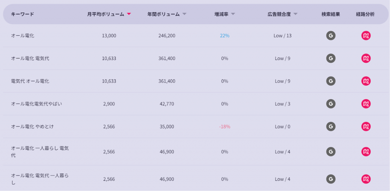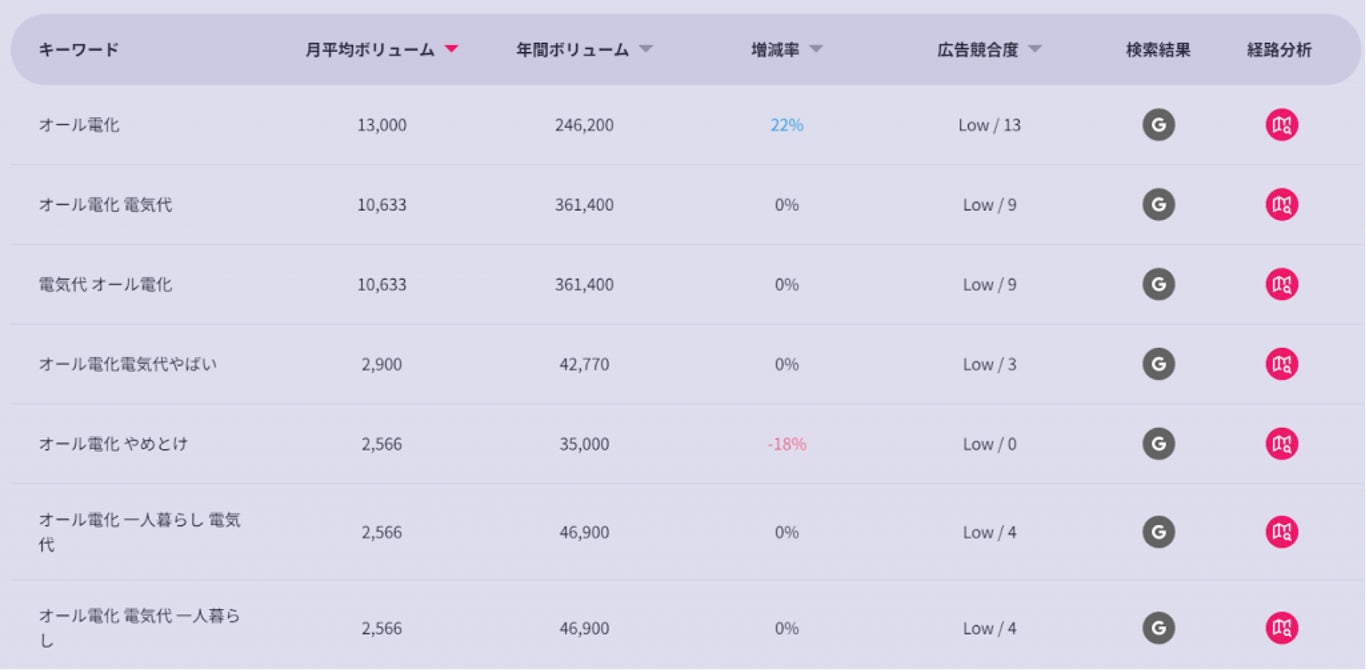 月間平均ボリューム順にみると、[電気代→電気代やばい→やめとけ→一人暮らし電気代]という順に検索されていました。やや否定的なキーワードが見えますね。