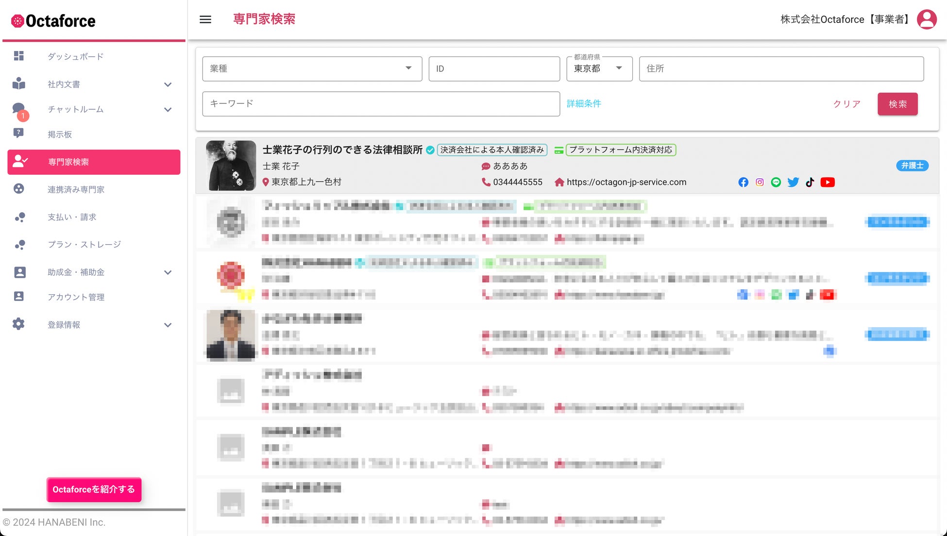 Octaforceに登録している事業者・専門家を検索してコンタクトでき、顧問契約や、個別の案件依頼について契約前に相談することができます。