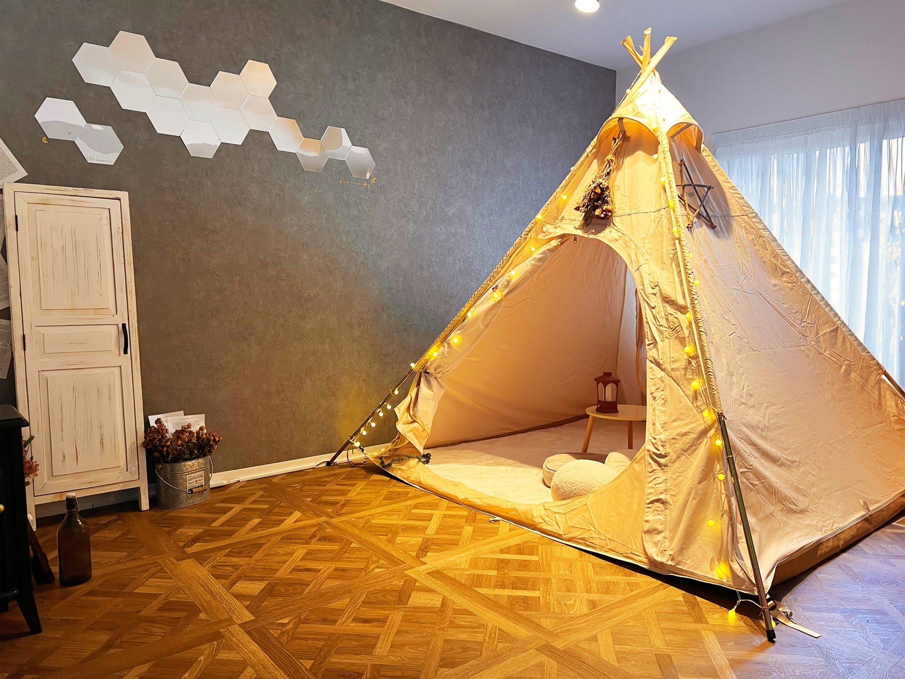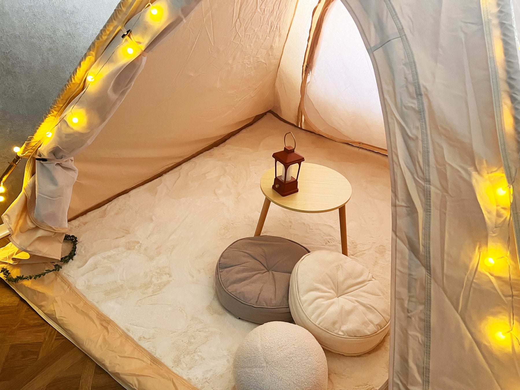 施設内には、リラクゼーションエリアとしてテントを設け、プロジェクションを設置し、キッチンエリアも完備しており、ご家族や仲間とともに心地よいひとときを過ごせます。付近には飲食店やスーパーなども近く、気軽にパーティも楽しめます。