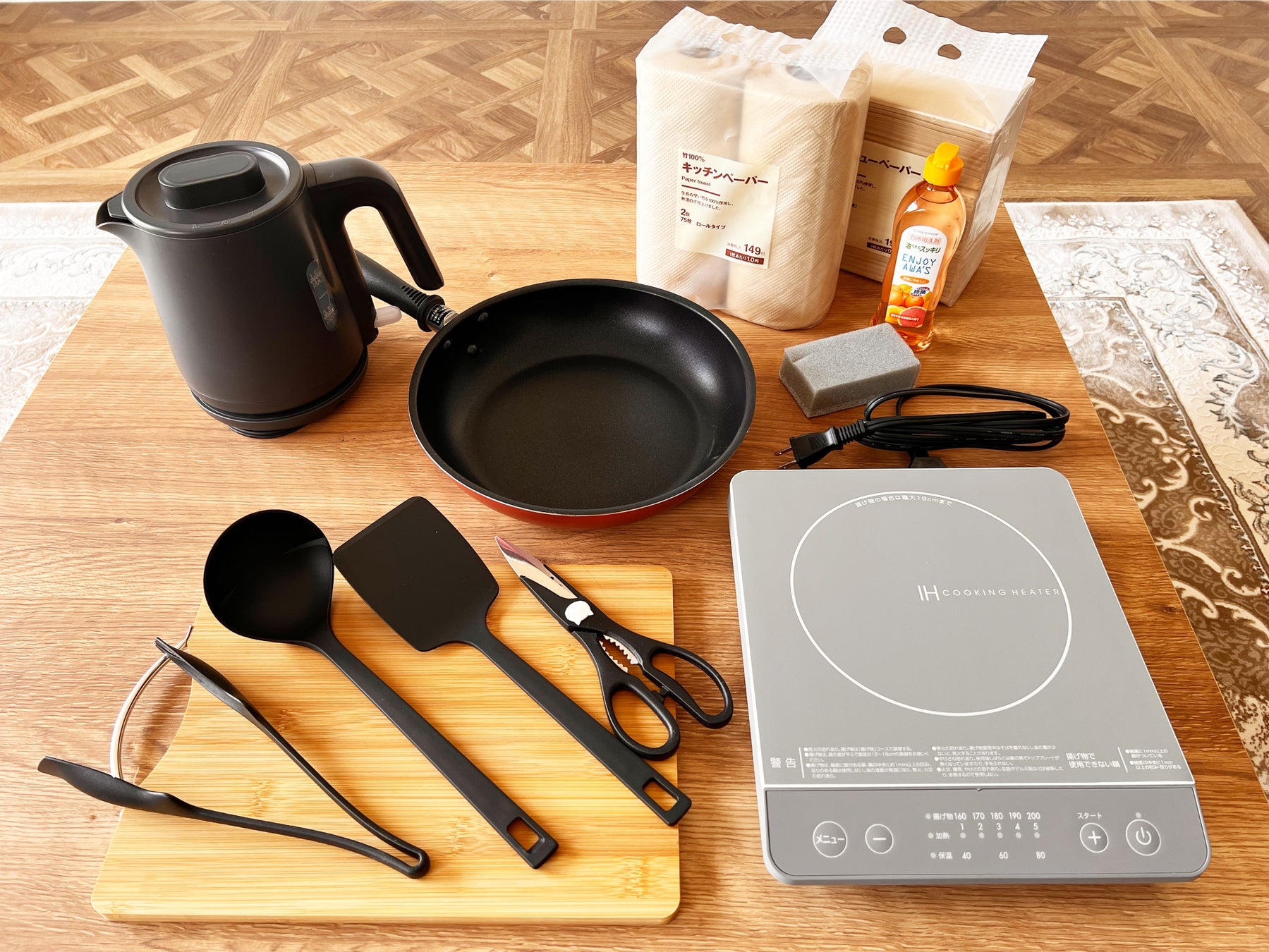 【設備】:冷凍冷蔵庫、電子オーブンレンジ、プロジェクター、鏡、調理器具一式、エアコン