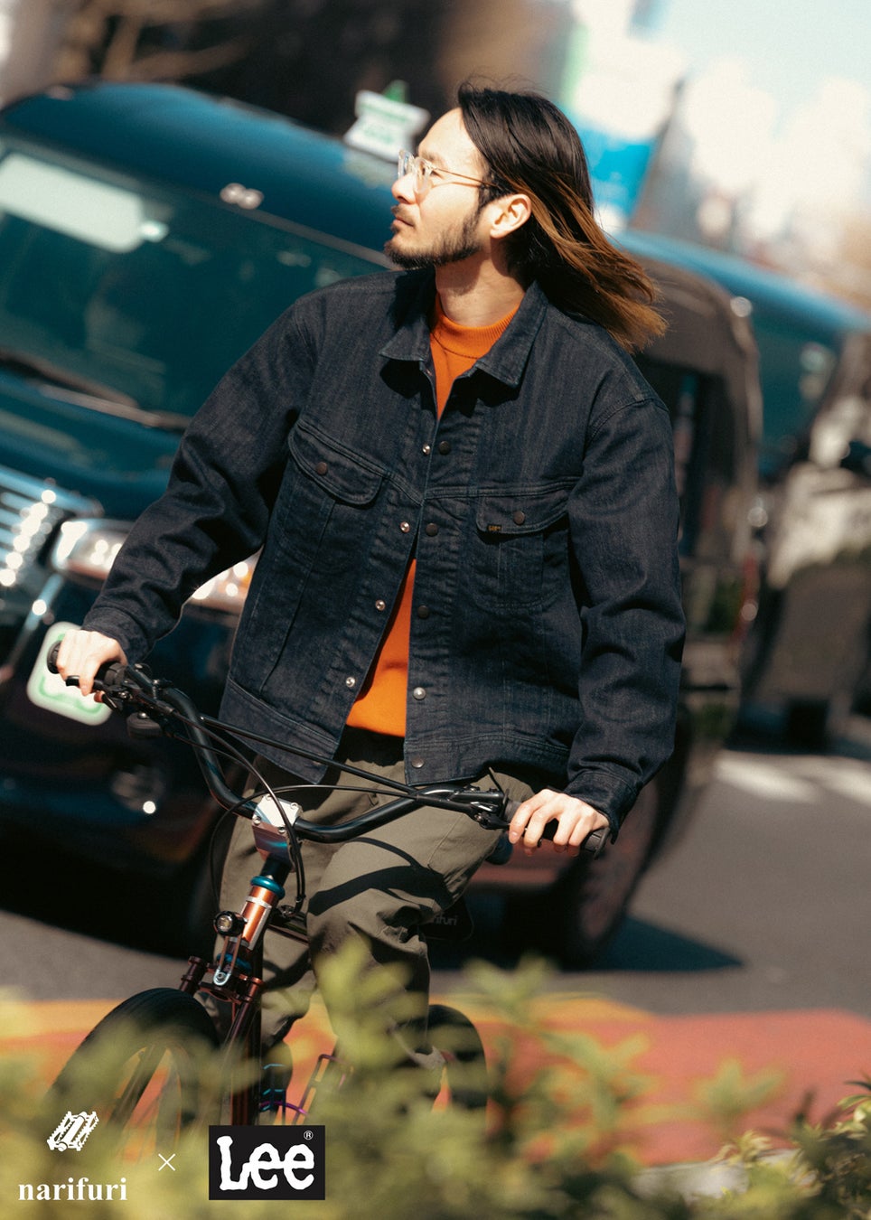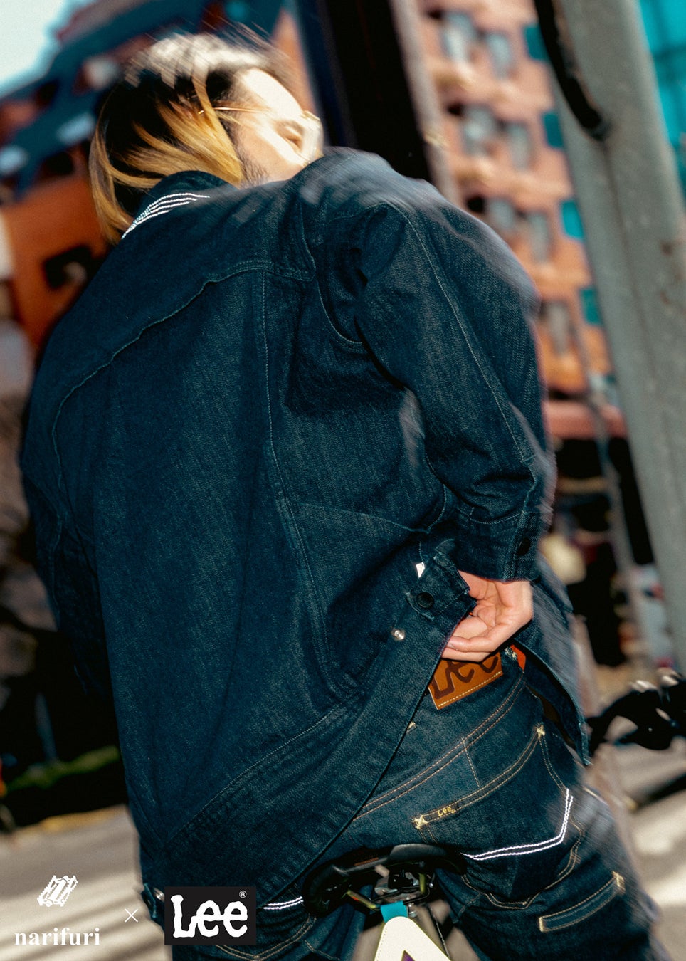 「narifuri/ナリフリ」と「Lee/リー」のコラボレーション最新作。Leeデニムジャケットの原点=Riders 101-J を、サイクリスト仕様に再解釈をしたライダースデニムジャケットを発売。
