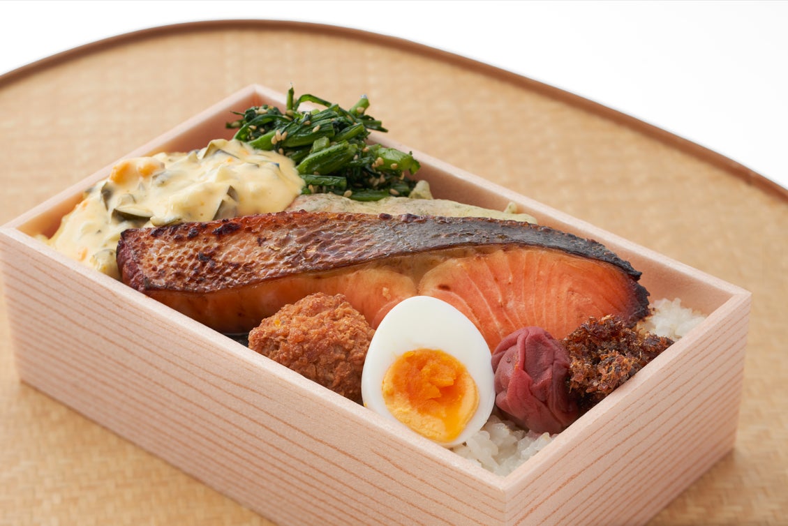 おかずは、オリジナルレシピで作り上げた「鮭の西京焼き」や「鶏つくね」をはじめ、 鯛100%ちくわを使用した「ちくわの磯辺揚げ」に「特製タルタルソース」を合わせるなど、奥深い味わいをお楽しみいただけます。