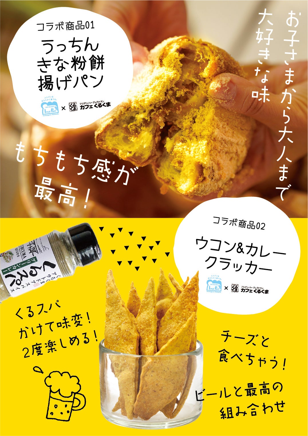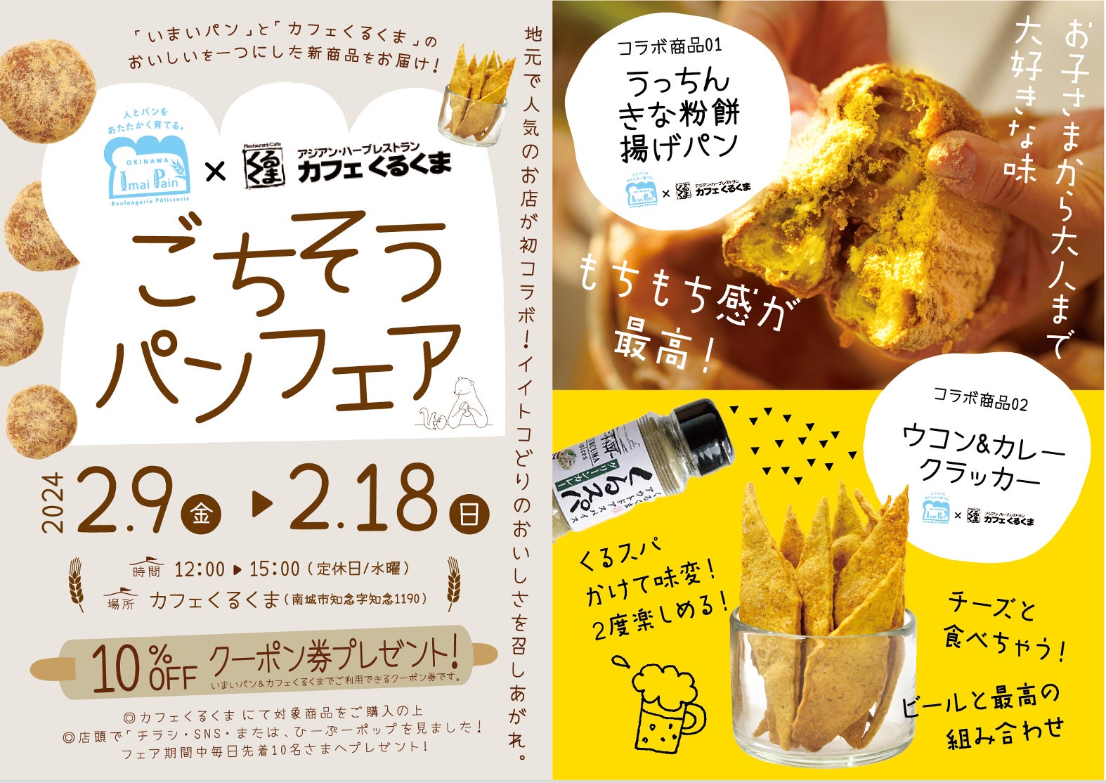 那覇のパン店「いまいパン」と南城市の絶景カフェ「カフェくるくま」が初コラボ。イベント限定で2店のおいしいを合わせたパン「うっちんきな粉餅揚げパン」と焼き菓子「ウコン&カレークラッカー」をお届けします!