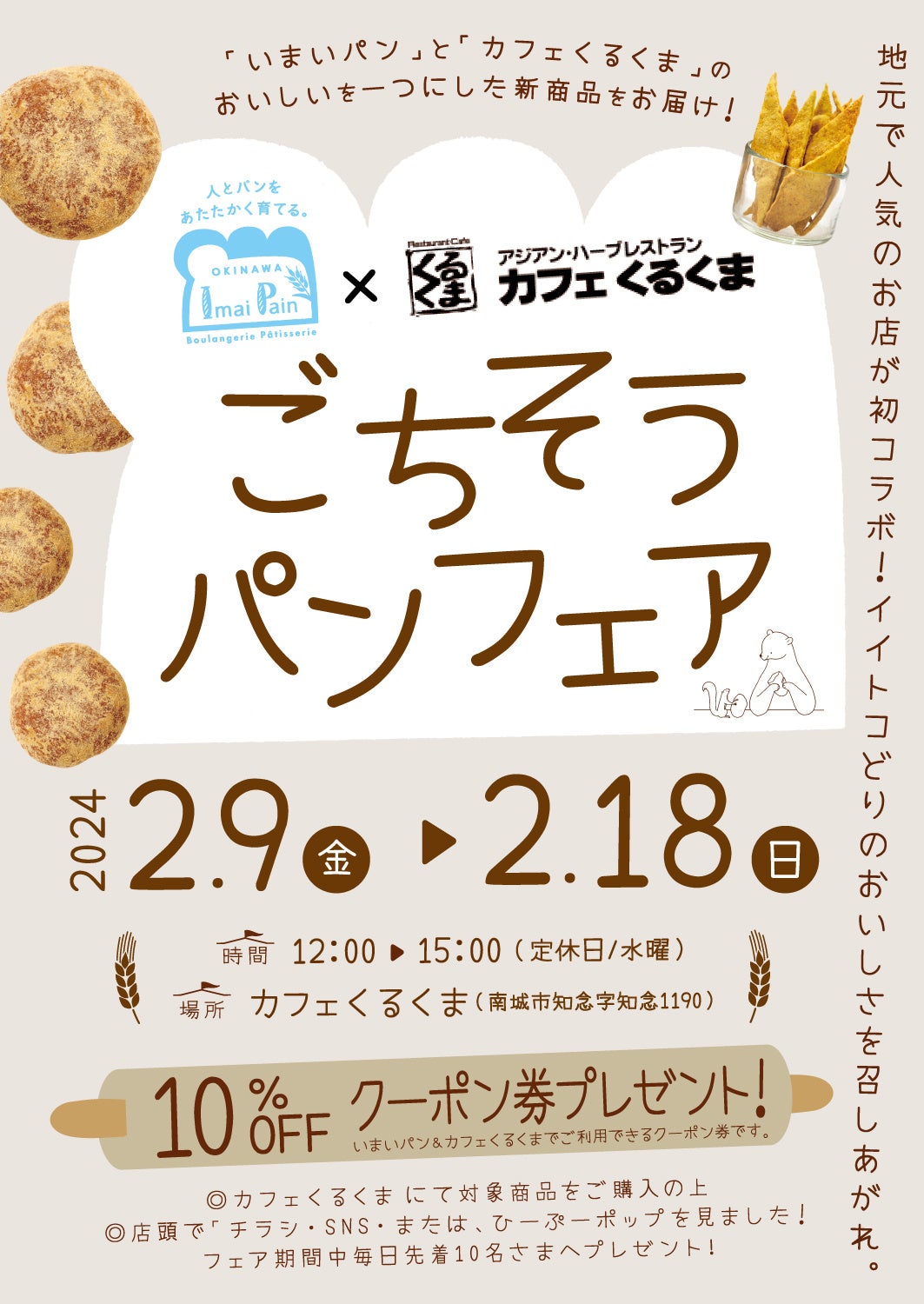 コラボレーション商品の発売を記念して、イベントにてコラボ商品を購入すると、「いまいパン」の商品10%割引券と「カフェくるくま」の食事10%割引券をプレゼント(期間中毎日10名様限定)。