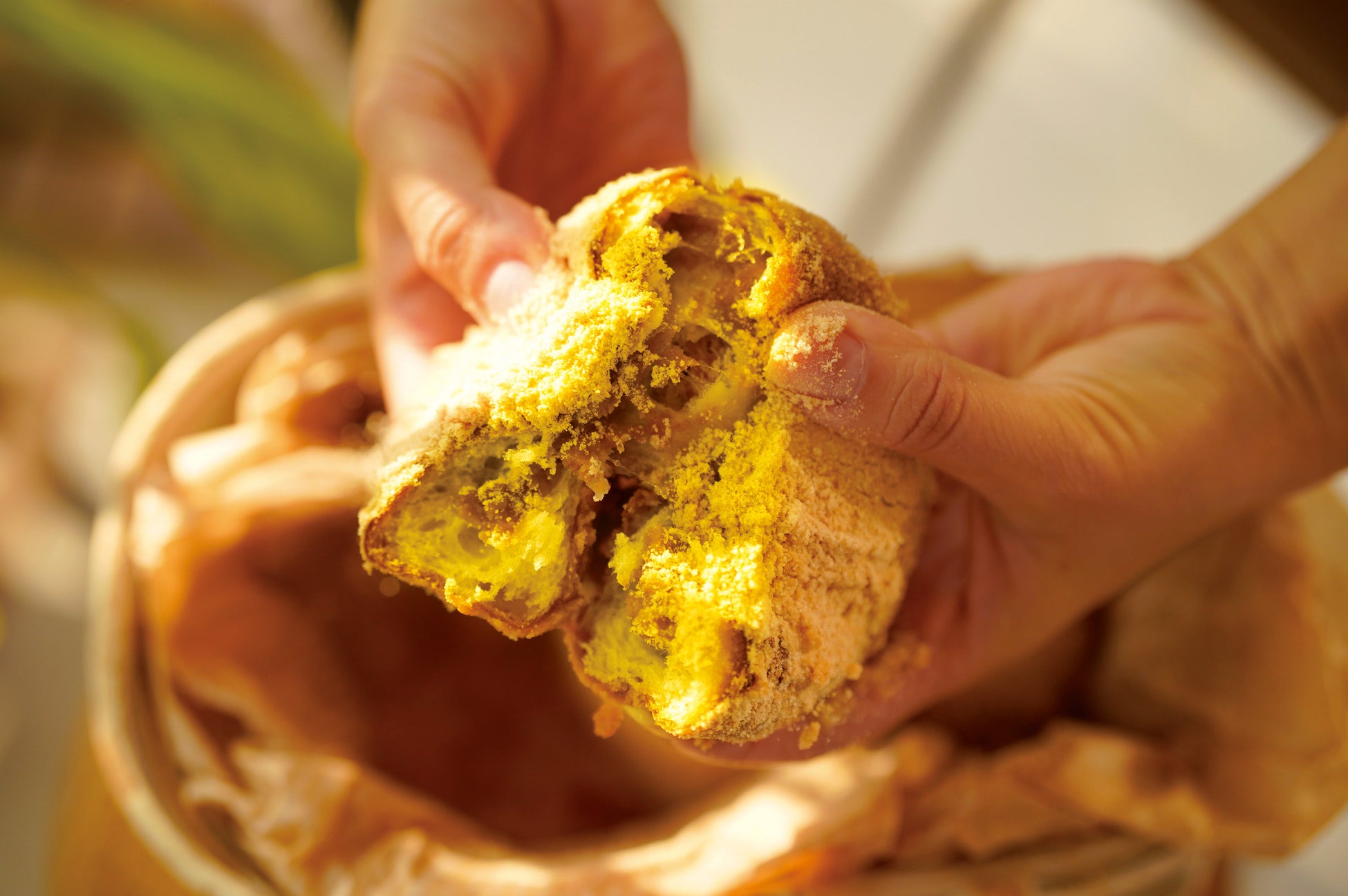 今回のコラボ商品は、イベント期間中、会場限定&数量限定で発売します(水曜日は定休)。1つはイベントで1日500個完売したいまいパンの看板商品「黒糖きな粉餅揚げパン」の生地にウコンを練り込んだ「うっちんきな粉餅揚げパン」。もちもち食感にウコンの風味とほど良い甘さが調和、半分に割ったときの黄色みでハッピーを感じられる、食べごたえたっぷりのごちそうパンです。