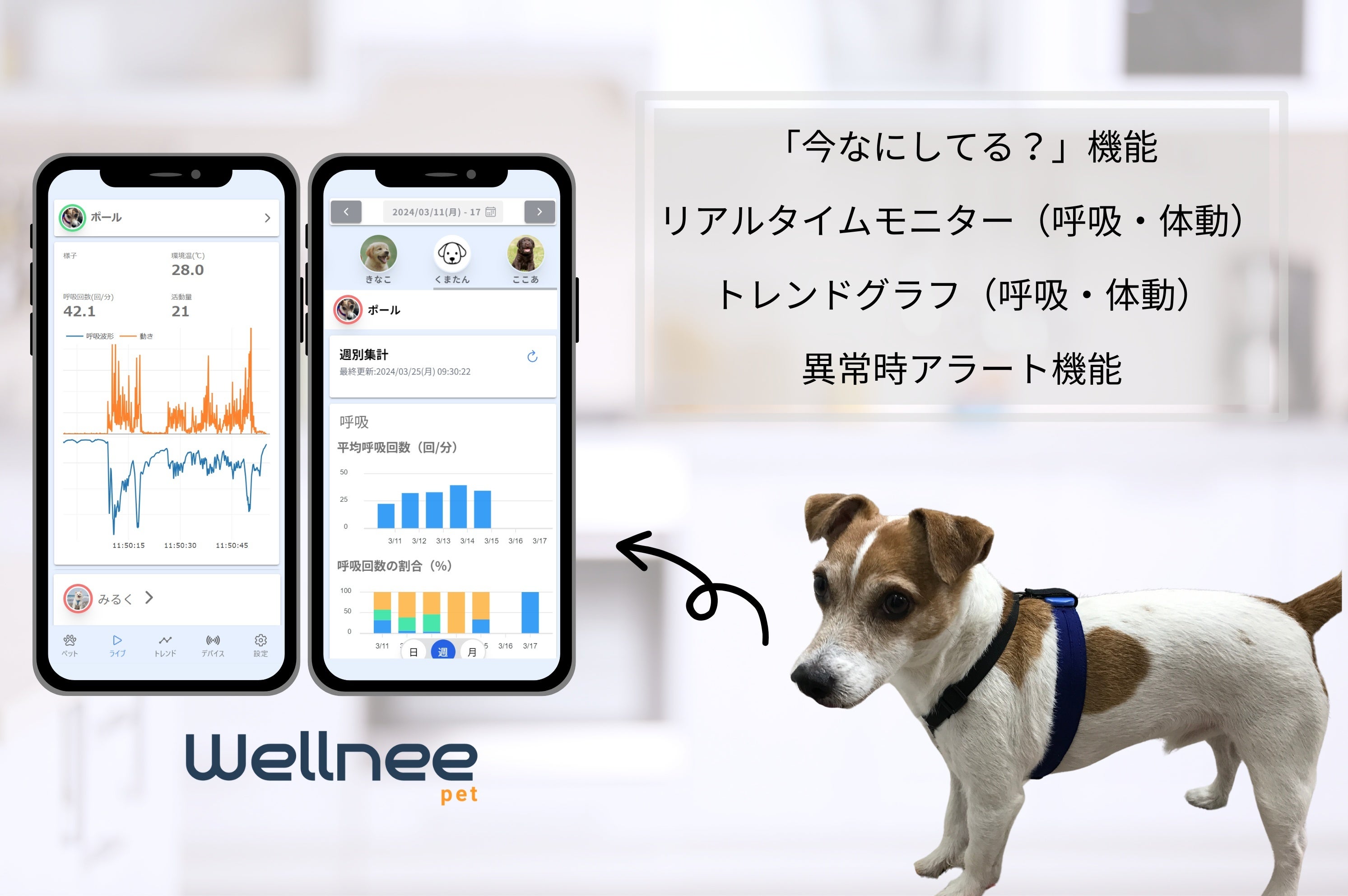 ウェルネー・ペットは、特殊なゴム紐で作られたセンサーが織り込まれているハーネスに超小型の本体を装着するだけで、お留守番中の愛犬の呼吸・体動などの情報をリアルタイムでモニタリングできます。