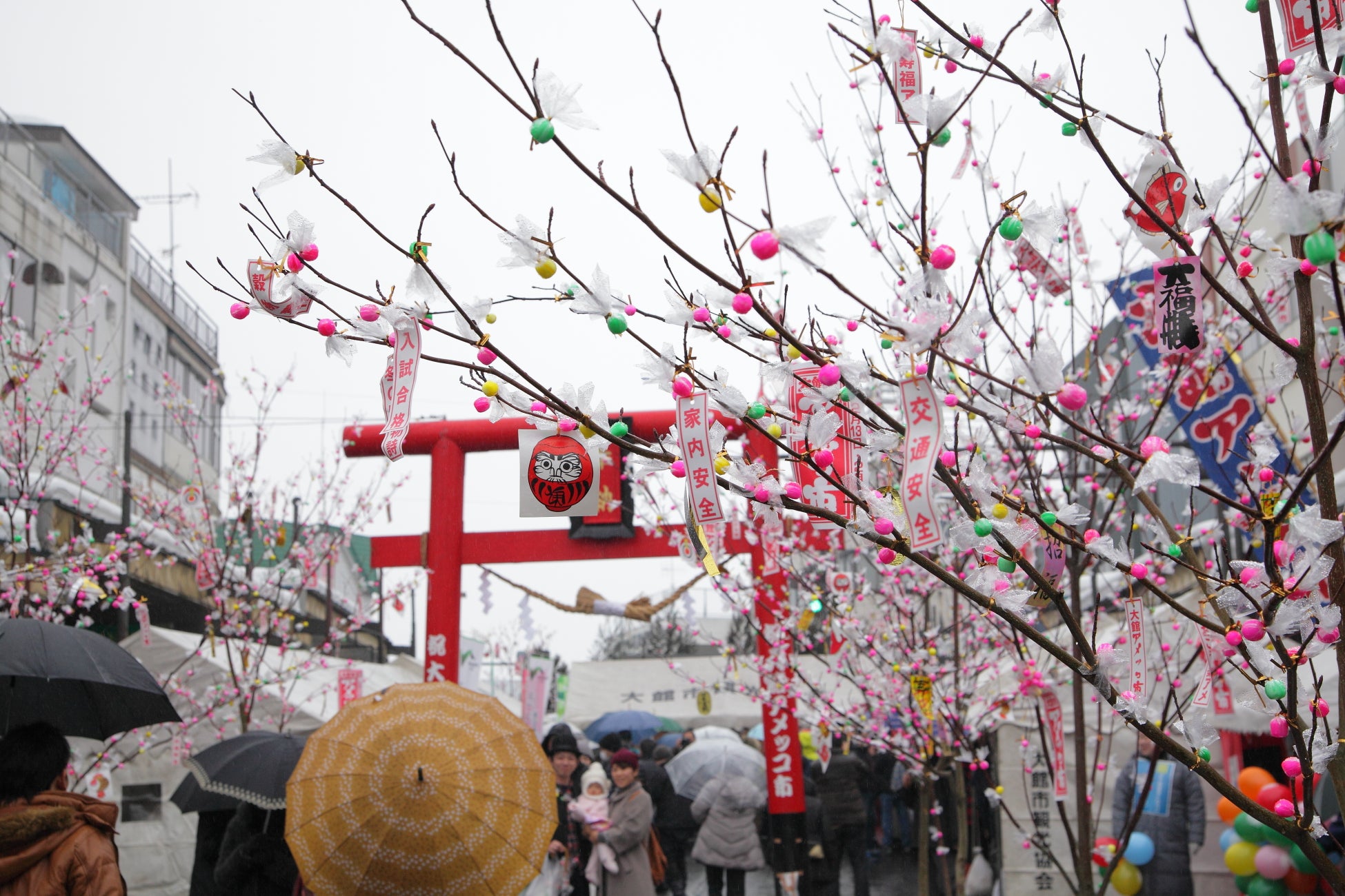 アメッコ市の起源は、天正16年(1588年)頃と言われています。その日にアメを食べると風邪をひかないとの言い伝えがあり、「枝あめ」で彩られた通りには多くの露店が並び、それぞれ「細工アメ」、「切アメ」など、趣向を凝らした色とりどりのアメが売られています。近くの田代岳から「白ひげ大神」がアメを買いにやってくるという伝説を再現した「白ひげ大神巡行」などの見どころも満載です。