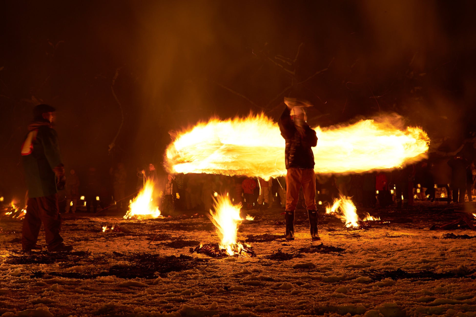 炭俵に1mくらいの縄を結び、その俵に火を付けて縄の先端を持ち、自分の体のまわりを振り回します。 旧暦の小正月行事の一つで、神聖な火で田んぼの厄を払うとともに、家族の無病息災・家内安全など一年の無事を祈願します。