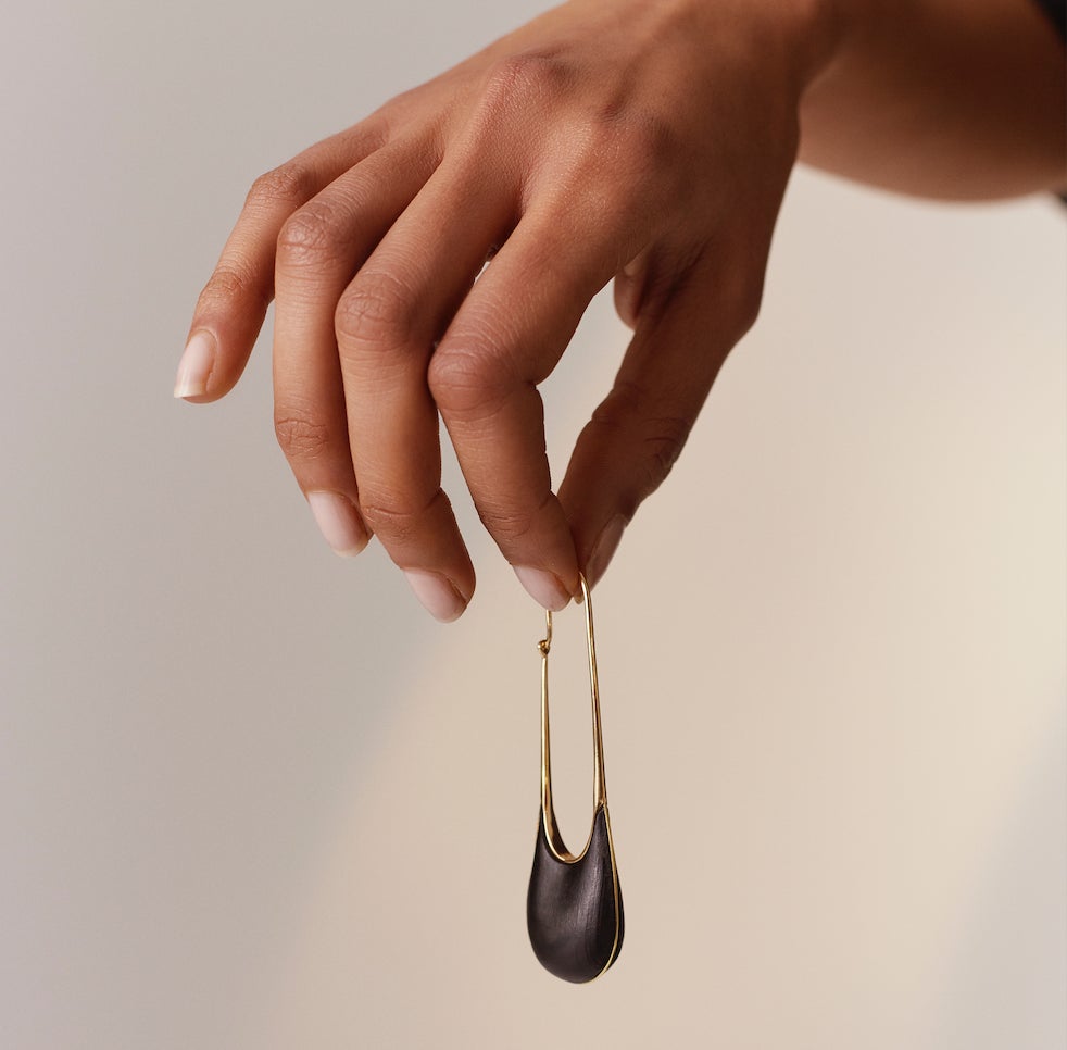 唯一無二の美しいジュエリー。建築家出身のデザイナー、サーラのインスピレーションの源は“世界の美しさ“であり、日常に浸透する“美“をジュエリーに反映。18 金ゴールド、スターリングシルバー、楽器にも使われるというアフリカの木材「ムピンゴウッド」という 3 つの上質な素材に特化し、エシカル(倫理的)にもこだわった、時の変化にも耐えるジュエリーを展開しています。