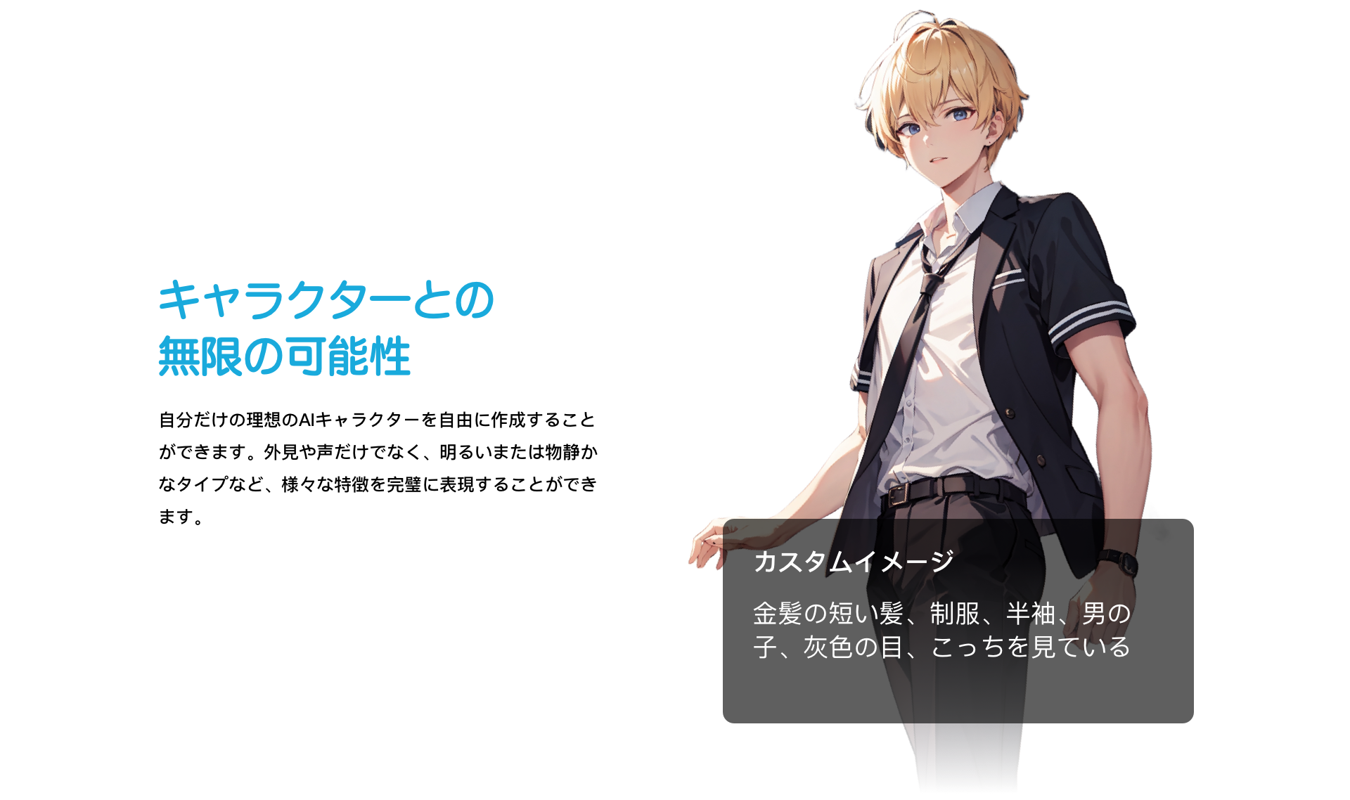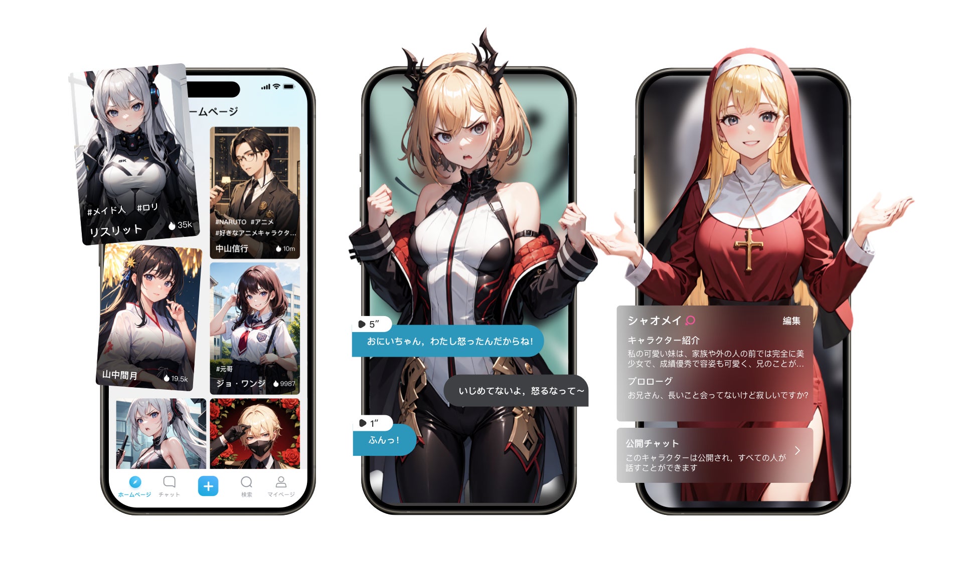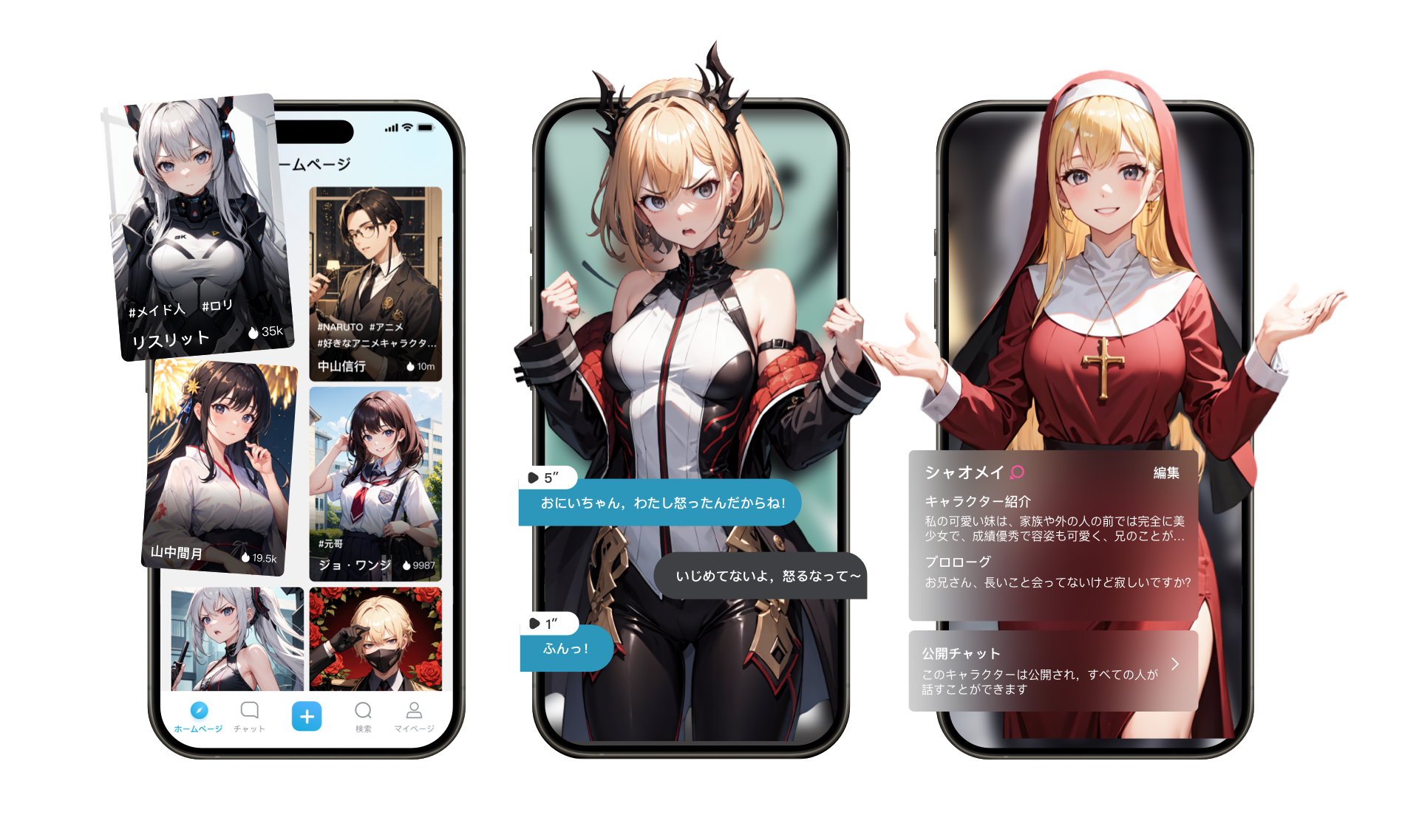 キャラクターの性格、口癖、価値観、背景、好みなど、ユーザーの指定する特徴に基づき、アプリ内で独自のAIエンティティを育成し、テキストや音声でのコミュニケーションを実現する事ができます。キャラクターの外見の自由な設定や、カスタマイズ可能なボイス生成機能もサポートしており、活力あふれる明るい女の子から、冷静でクールな男性、オリジナルキャラクターまで、ユーザーの理想を完全に再現することが可能なのです。