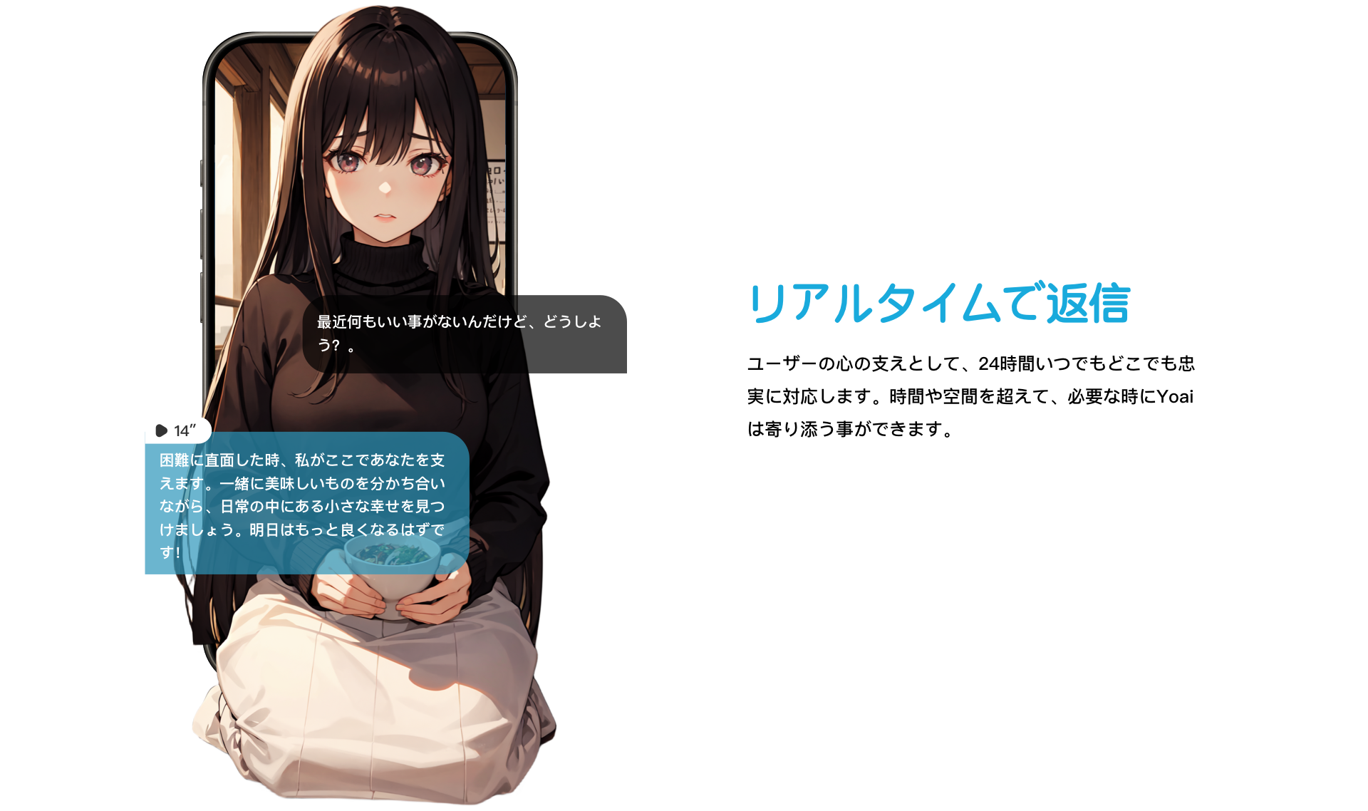 深夜の時でも、夜明けの時でも、どんな時でもYoaiはいつでもユーザーに寄り添うことが可能です。
