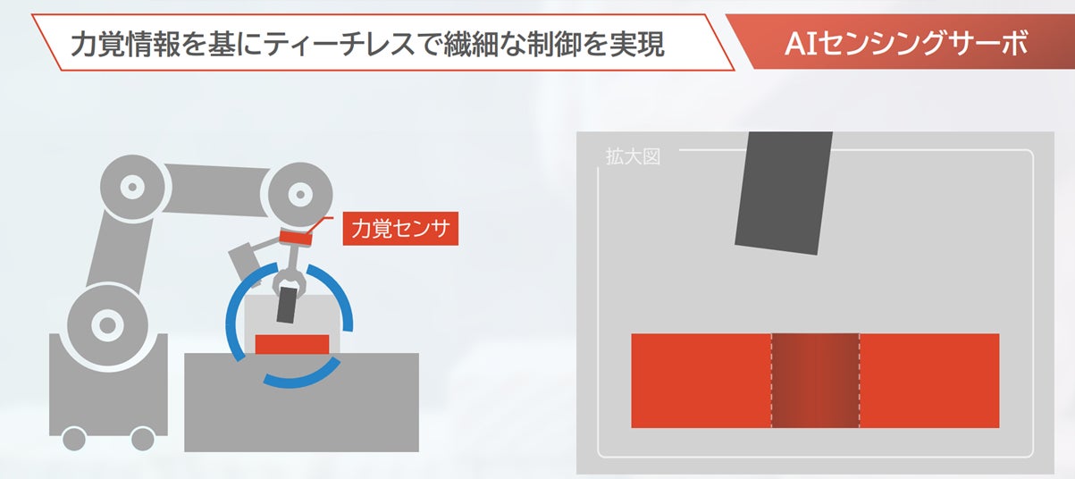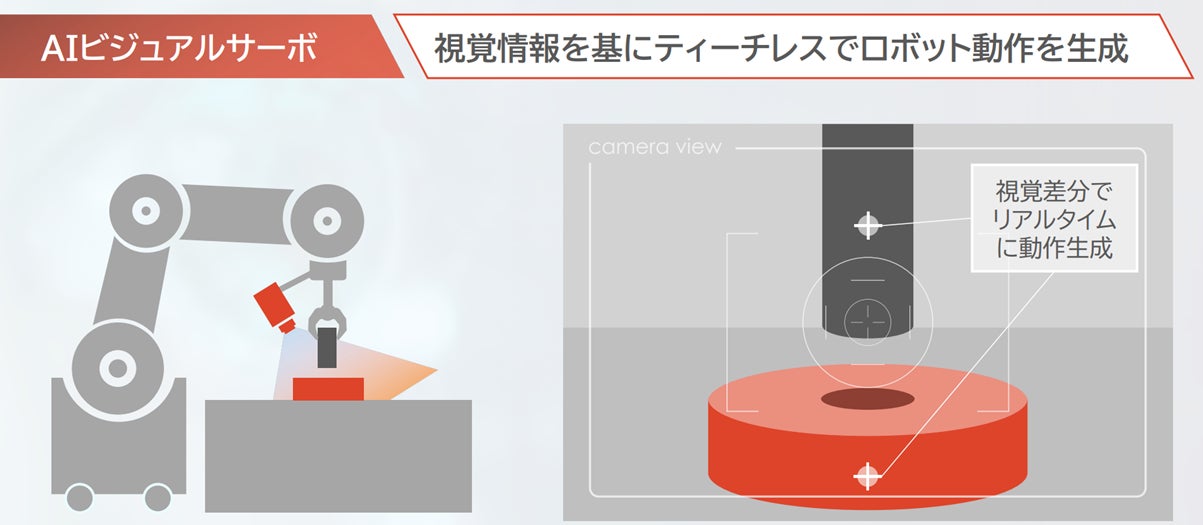 「AI Servo Robot System」は、投資回収が困難だった組立工程を自動化するロボットシステムです。AIビジュアルサーボとAIセンシングサーボが高精度で繊細な動作に対応し、ロボットティーチやカメラキャリブレーションを不要とします。