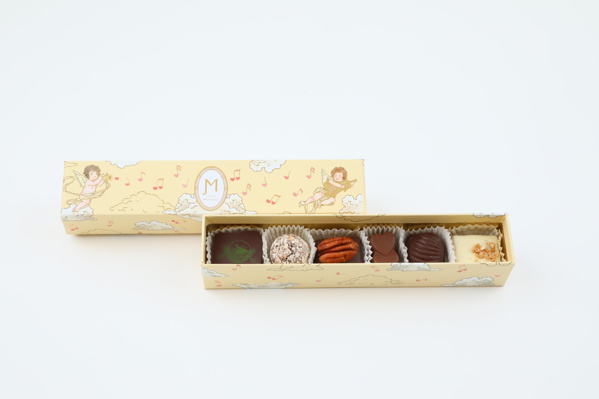 音楽を奏でる天使がモチーフのデザインです。マダムドリュックを象徴するショコラ「1919」に加え、「レディ」「ブランシュ」「エリザベス」「マチルド」「アマンディーン」の6粒入り。定番のガナッシュ、トリュフ、プラリネ、キャラメルがバランスよく楽しめるアソートです。