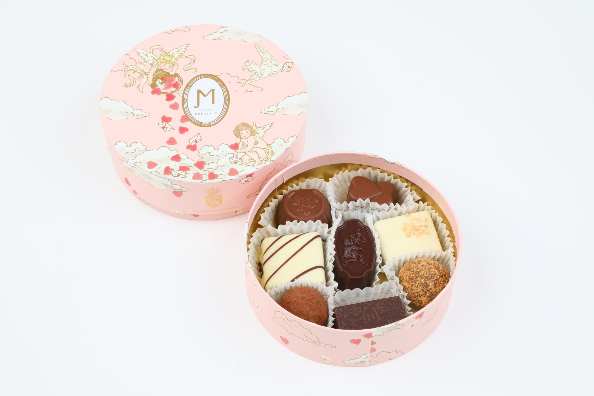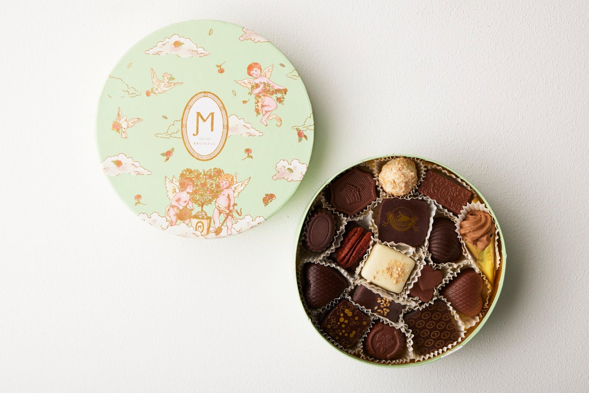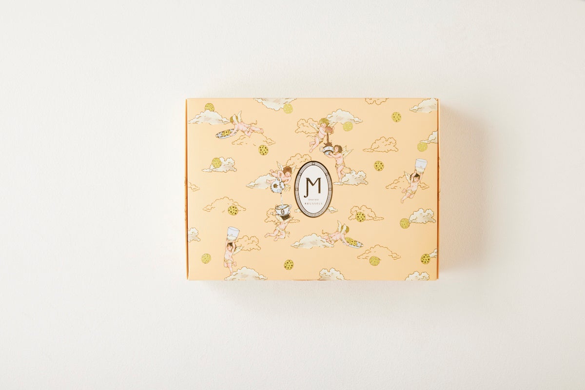 庭園で遊ぶ天使がモチーフのデザインです。ラウンド型のボックスには、マダムドリュックで人気のフレーバーを詰め合わせました。ベルギーの伝統と創業者マリーの思いがつまった16粒入りです。