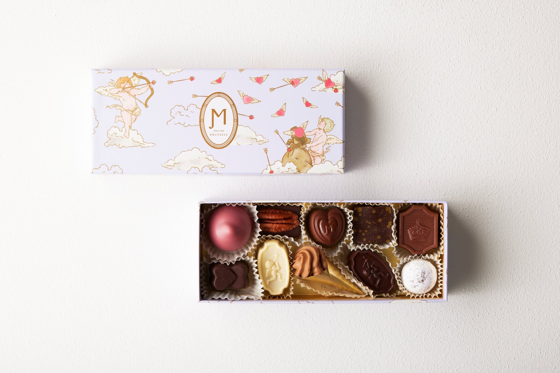 ハートを射抜く天使がモチーフのデザインです。店舗アソートには、2024年新作ショコラ4種に加え、定番のガナッシュ、プラリネ、トリュフ、キャラメルなどをバランスよく詰め合わせた10粒入りです。