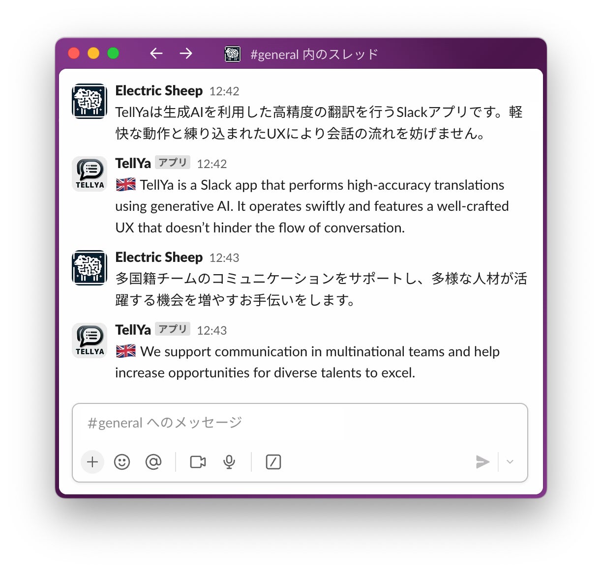 また、エレクトリック・シープ社は、第一弾のプロダクトとして、Slack翻訳アプリのTellYa(テルヤ)をリリースしました。