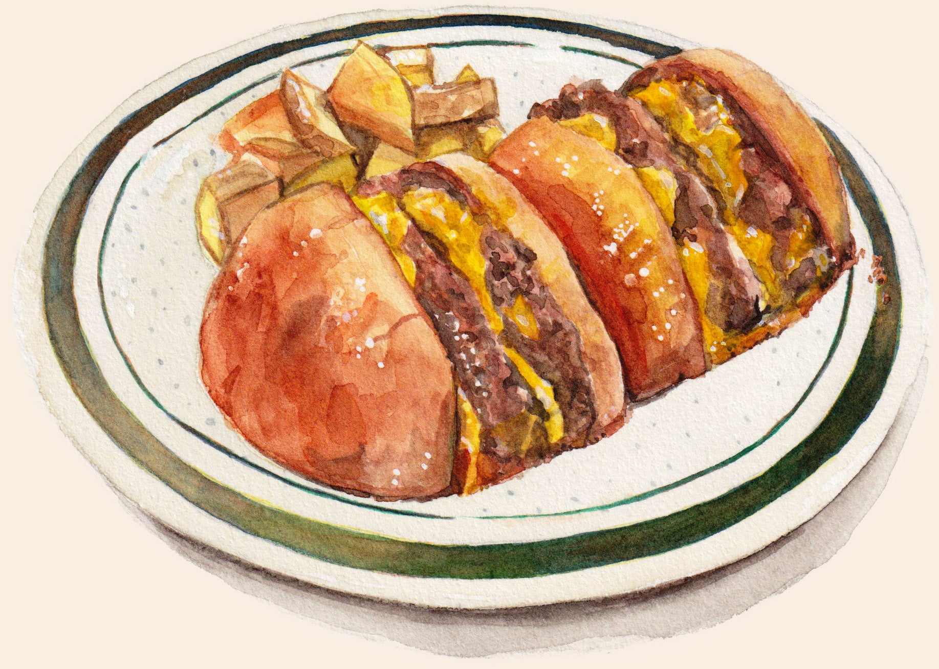 そして、数あるこだわりメニューの中でも、他に類を見ない手法で作る「切ったやつ」がBRISKSTANDの名物となっています。ハンバーガーを縦に切り、その断面を熱々の鉄板で二度焼きすることで、パティや具材に肉汁をしっかりと吸わせる逸品です。限定食のため、開店前から「切ったやつ」を求めて列ができることも。思わず写真を撮りたくなる斬新な見た目と香ばしい断面の食感が、多くのお客様からご好評いただいています。