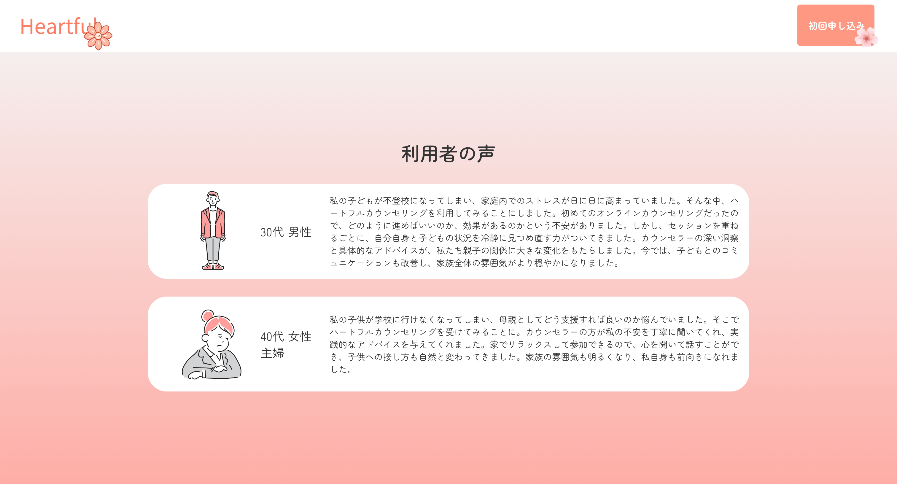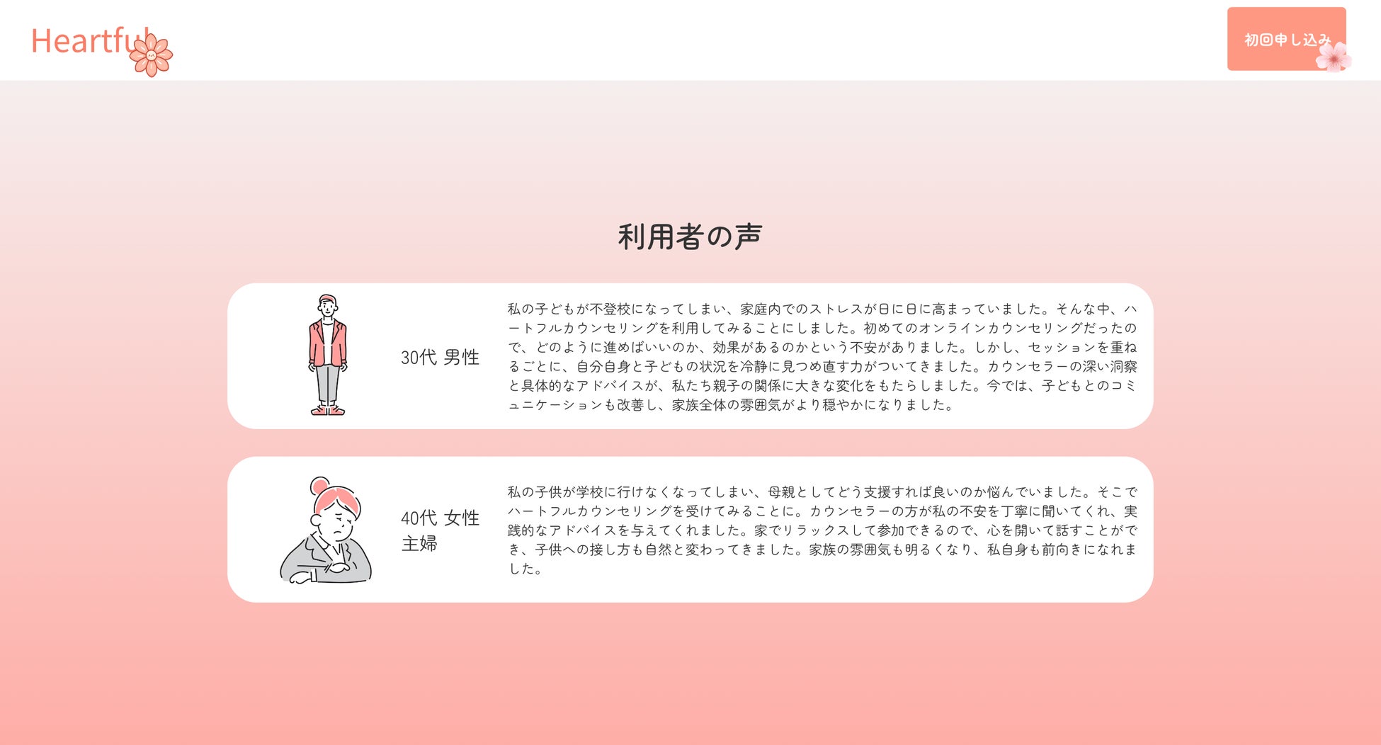 ハートフルカウンセリング(https://heartful-counseling.jp/)は、不登校児の保護者に向けたオンラインカウンセリングです。