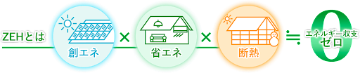 当社では、2016年よりZEHビルダー登録を行い、現在では新築住宅のほとんどをZEH住宅にするという目標を掲げております。ZEHとはnet Zero Energy House(ネット・ゼロ・エネルギー・ハウス)の略で、「創エネ×省エネ×断熱」に取り組み家のエネルギー収支をゼロ以下にする住宅のことを指します。ZEHの家は、エネルギーを自給自足し、ランニングコストを抑え、快適な住まいを実現できる、まさにこれからの新築住宅のスタンダードになりつつあるのです。