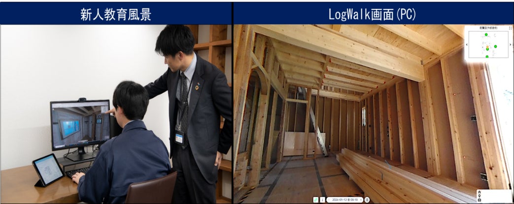 従来現場にて行なっていた新人教育が、360度写真を活用することで場所もタイミングも選ぶことなく行うことが出来ます。 またLog Walk(※写真参照)により、過去に遡った現場指導も可能となります。