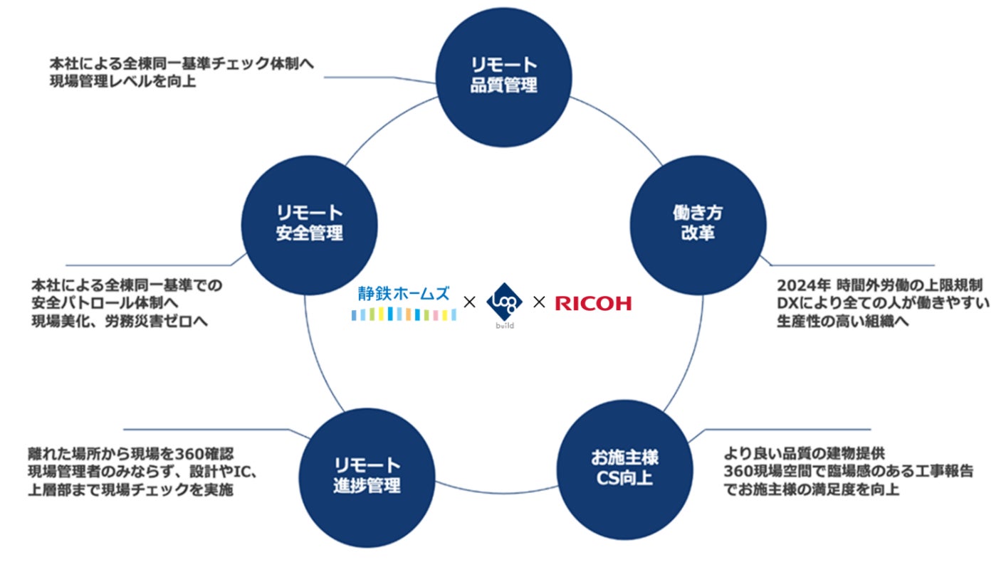 この課題解決の一環として、建設現場における品質と安全の管理レベルを一段と向上させるため、「品質管理・安全管理・進捗管理」を遠隔から実施可能なLog Systemを全棟にて採用を開始しました。新たに導入するLog Systemは、建設現場におけるデジタルトランスフォーメーション(DX)を進化させている株式会社 log build(本社:神奈川県横浜市、代表取締役:中堀 健⼀)により提供されています。このシステムと360度カメラのRICOH THETAの導入により、遠隔からの施工管理の体制を築くことができるため、オフィスやテレワーク環境での現場管理支援が可能となります。そのため、女性がより柔軟かつ快適な労働環境で活躍しやすくなり、建設業界全体でのダイバーシティ推進に繋がります。