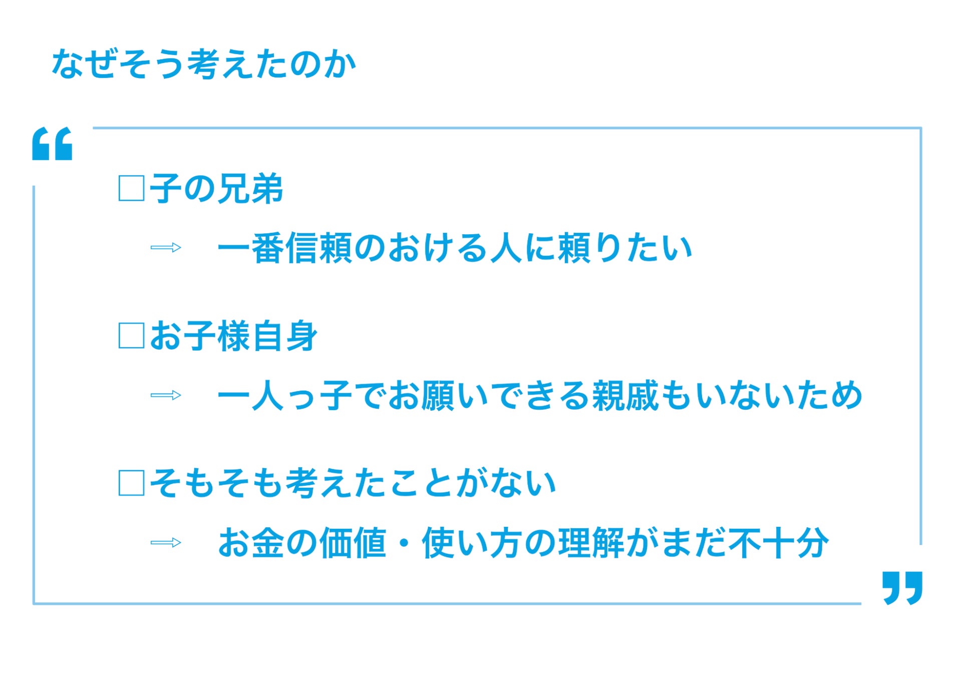 そして、支援の時間軸の幅は現在のみならず将来(親御さまの逝去)に対し、お子さまへの支援も考えた上で情報提供の幅を広げる必要もあると思います。
