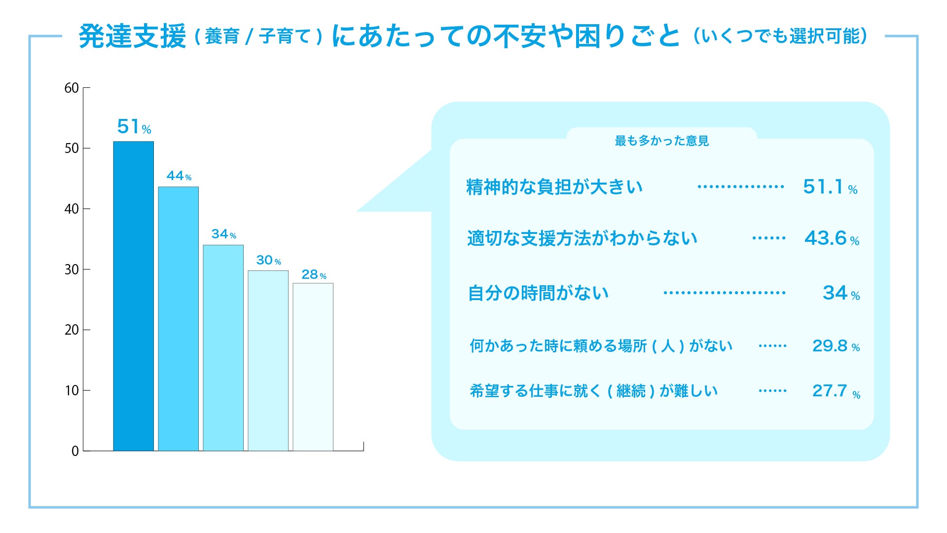 アンケート調査の結果、発達支援(養育/子育て)にあたって「精神的な負担が大きい」と答えたご家庭が51.1%と半数を占めました。続いて「適切な支援の方法が分からない」が43.5%となっており、ほとんどのご家庭が精神的な負担を抱えながらも何をするべきなのか分からないという状況が分かりました。