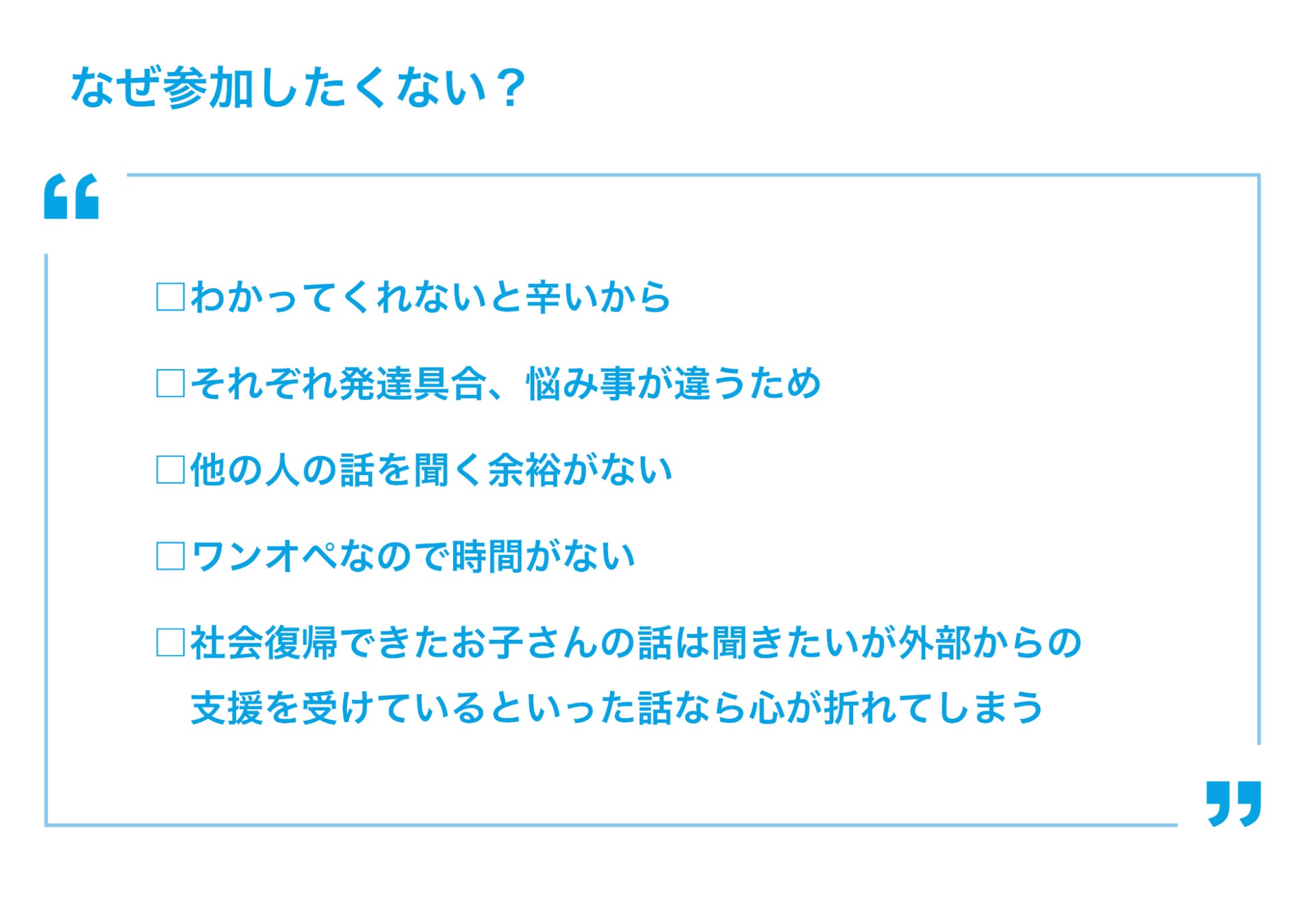 障がいの程度が近いお子様を持つ経験者や現支援者との交流を通じて、経験共有やアドバイスの交換が行える環境も求められていることが伺えます。