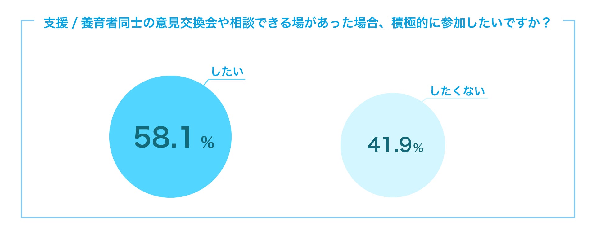 支援/養育者同士の意見交換会や相談できる場があった場合、積極的に参加したいという回答が58.7%となっており、その中でも「インターネット等では得られない詳しい情報を知りたい」「色々な情報の中から、一番あったものを選択したい」など何か情報が知りたいという意見が多数寄せられました。