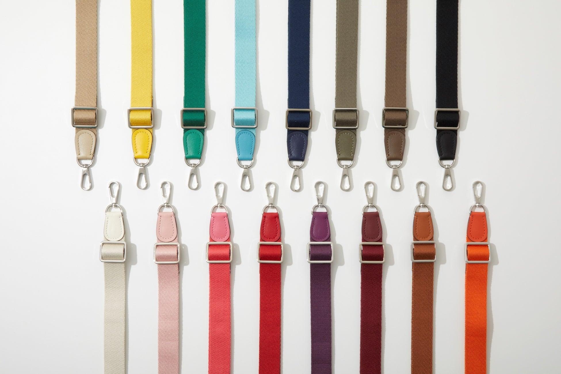 今回は、従来の14色に新色2色を加えた全16色から、お好きな色をあれこれ選べる「With Me」ショルダーストラップ(5cm幅:22,800円/2.5cm幅:19,800円)が勢揃い。ぜひお好きな色が売り切れる前にお越し下さい。
