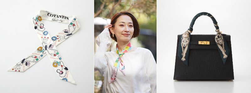 今回はさらに、新商品のバッグのハンドルに巻いたりヘアアクセとしても使えるポップなオリジナルシルクスカーフも同時販売します。