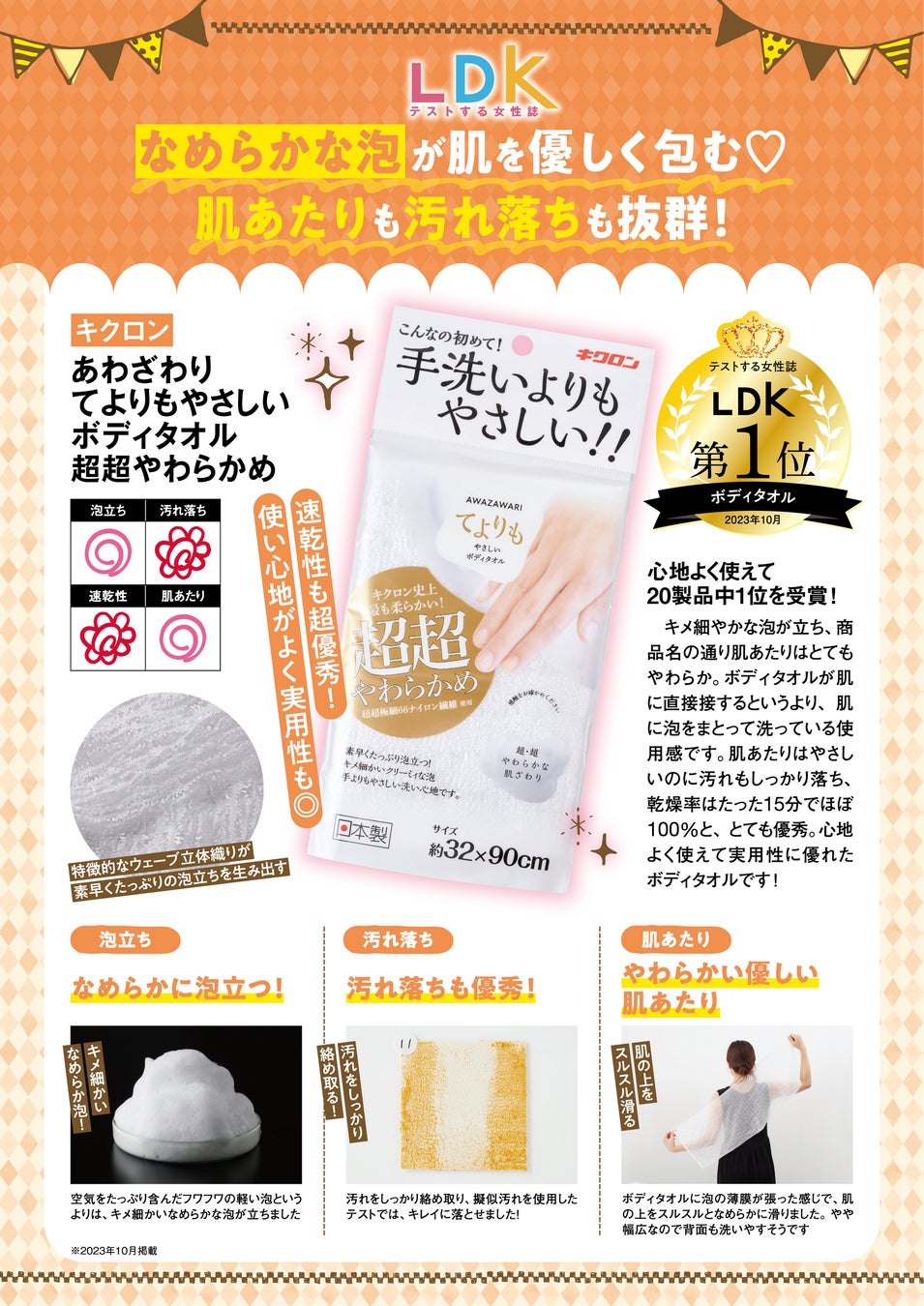 2023年10 月13 日公開の「360LiFEbyLDK 【2023 年】ボディタオルのおすすめ20 選。LDK が泡立ちや肌あたりなどを比較」において、「LDK 」編集部が泡立ち・汚れ落ち・速乾性・肌あたりについて比較調査を実施し、本商品が「なめらかな泡が肌を優しく包み、しっかり汚れを落とす」と評価頂き、ボディタオル部門第1 位を獲得しベストバイ商品に選定されました。「LDK2024 年2 月号」「LDK the Beauty 2024 年2 月号」にも掲載されています。