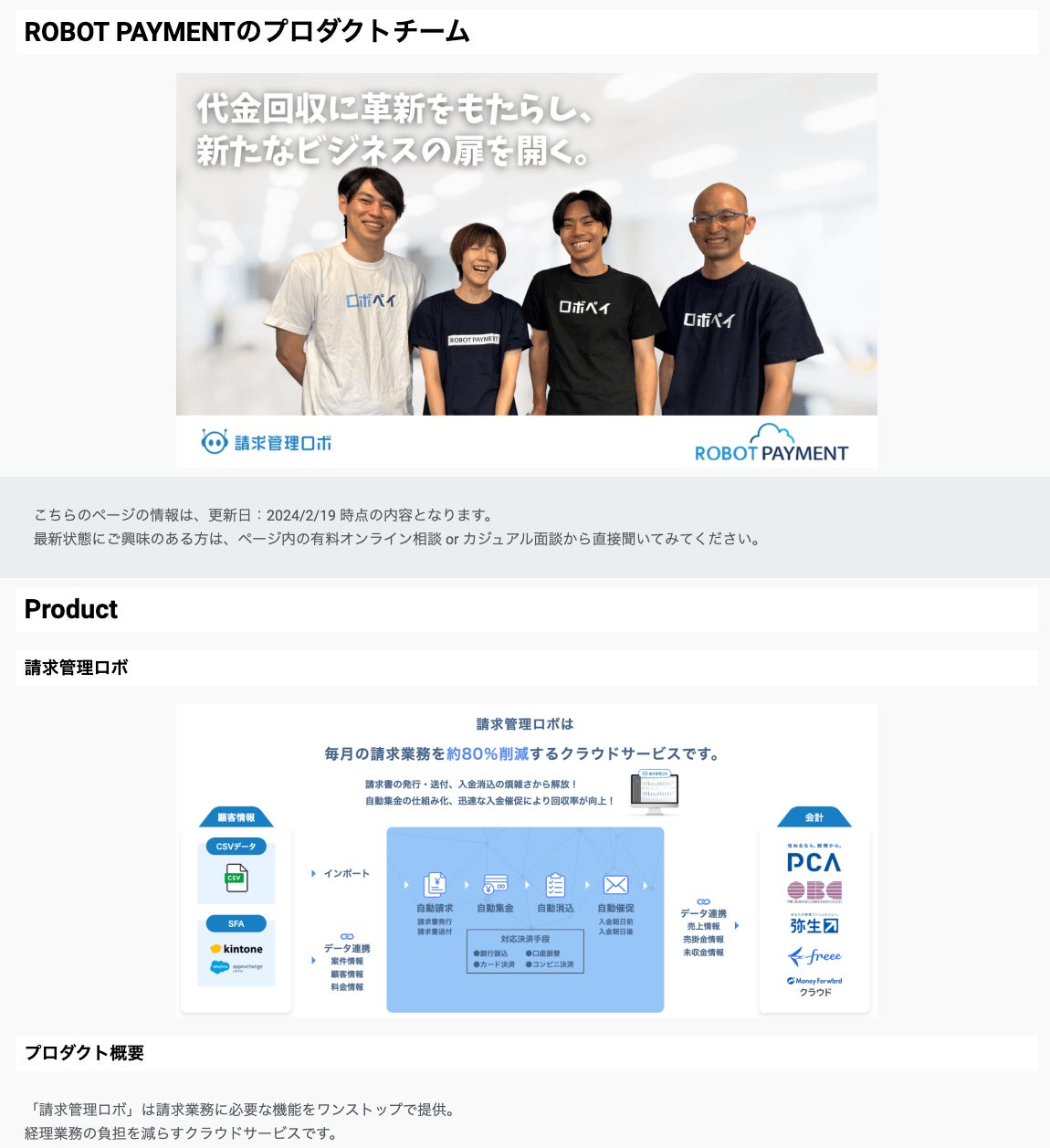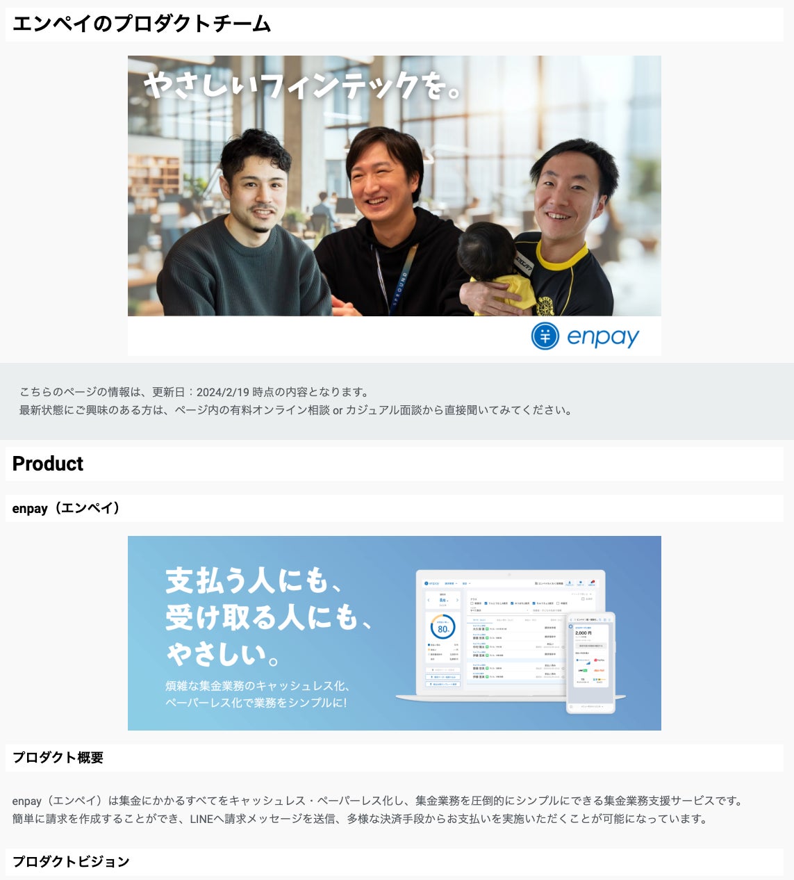半期ごとのキックオフなどで、社内向けにはプロダクトやチームに関する最新の方針や計画を共有されているプロダクトチームが多いと思いますので、その内容から社外へ発信可能な情報をご提供いただきプロダクトチーム広報ページを作成いたします。