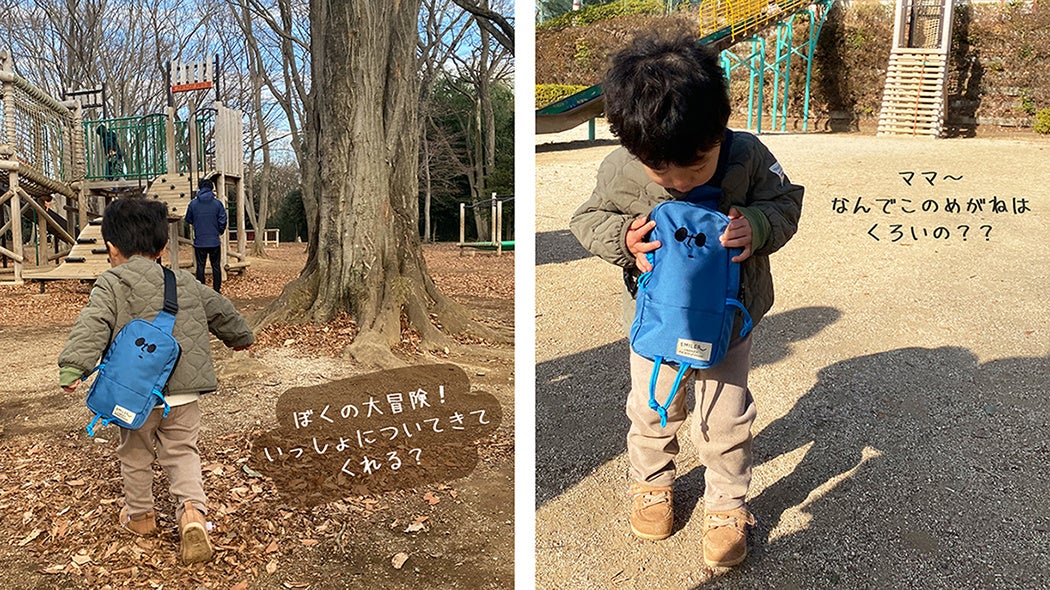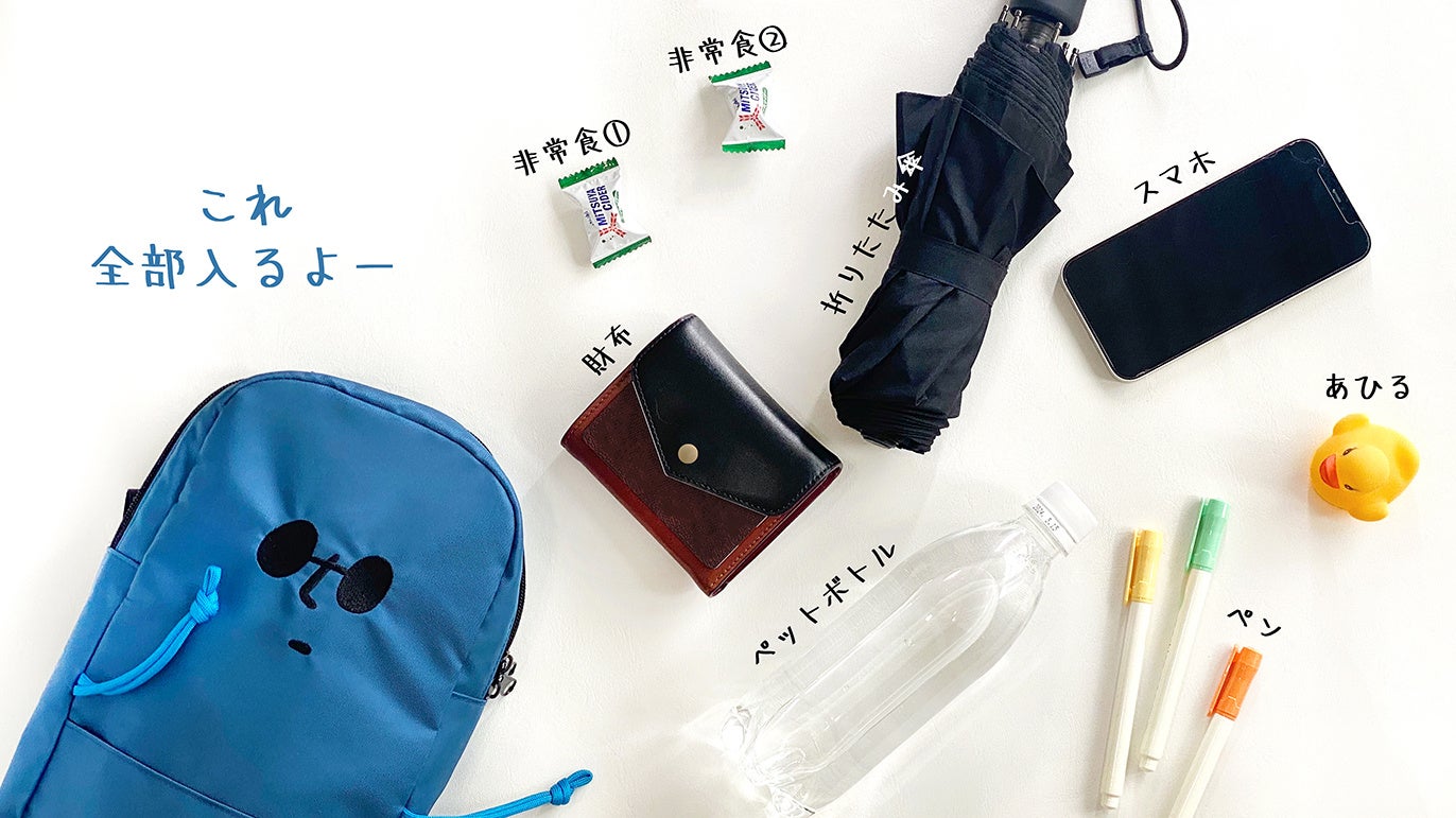 遊び心満載なBuddyくんですが、「バッグ」としても優秀です。ペットボトル、折りたたみ傘、財布、その他色々……必要なものが入るとても便利なサイズなので、こう見えて実は結構いい仕事します!