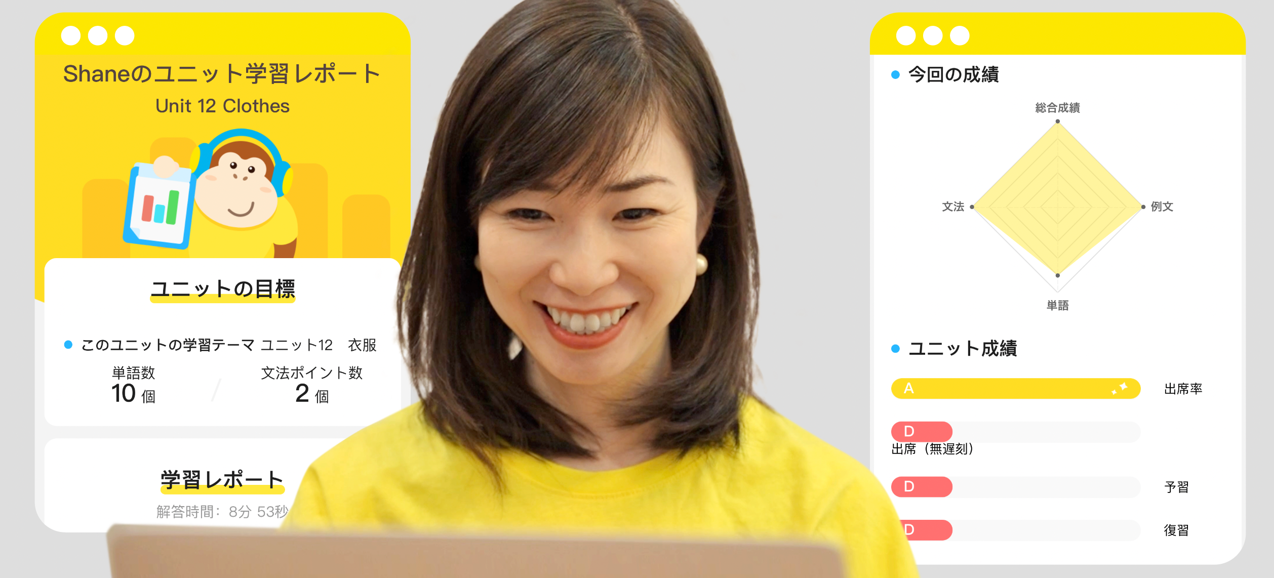 外国人講師に加えて日本人コーチが保護者に伴走。チャットを中心に個別相談やコーチング、英語教育に関する情報を提供し、お子さまの学習に関する保護者の方の不安解消に努めます。また、AIツールを活用して、お子さまの学習傾向やレッスンペース、不得意箇所などを可視化。データに基づいてお子さまの学習に寄り添う保護者の方もサポートします。