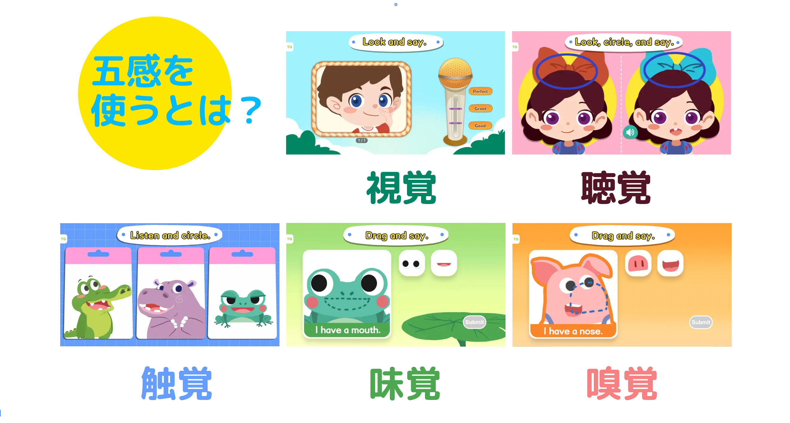 語彙力強化・フレーズ反復練習・アウトプット練習・クイズ形式・パズルゲーム・発音と文字の関係性学習など、ゲーミフィケーションの要素を取り入れているため、さまざまなコンテンツを五感を使って楽しみながら学べます。これにより自然と学習が身に付くほか、五感の発達も促します。