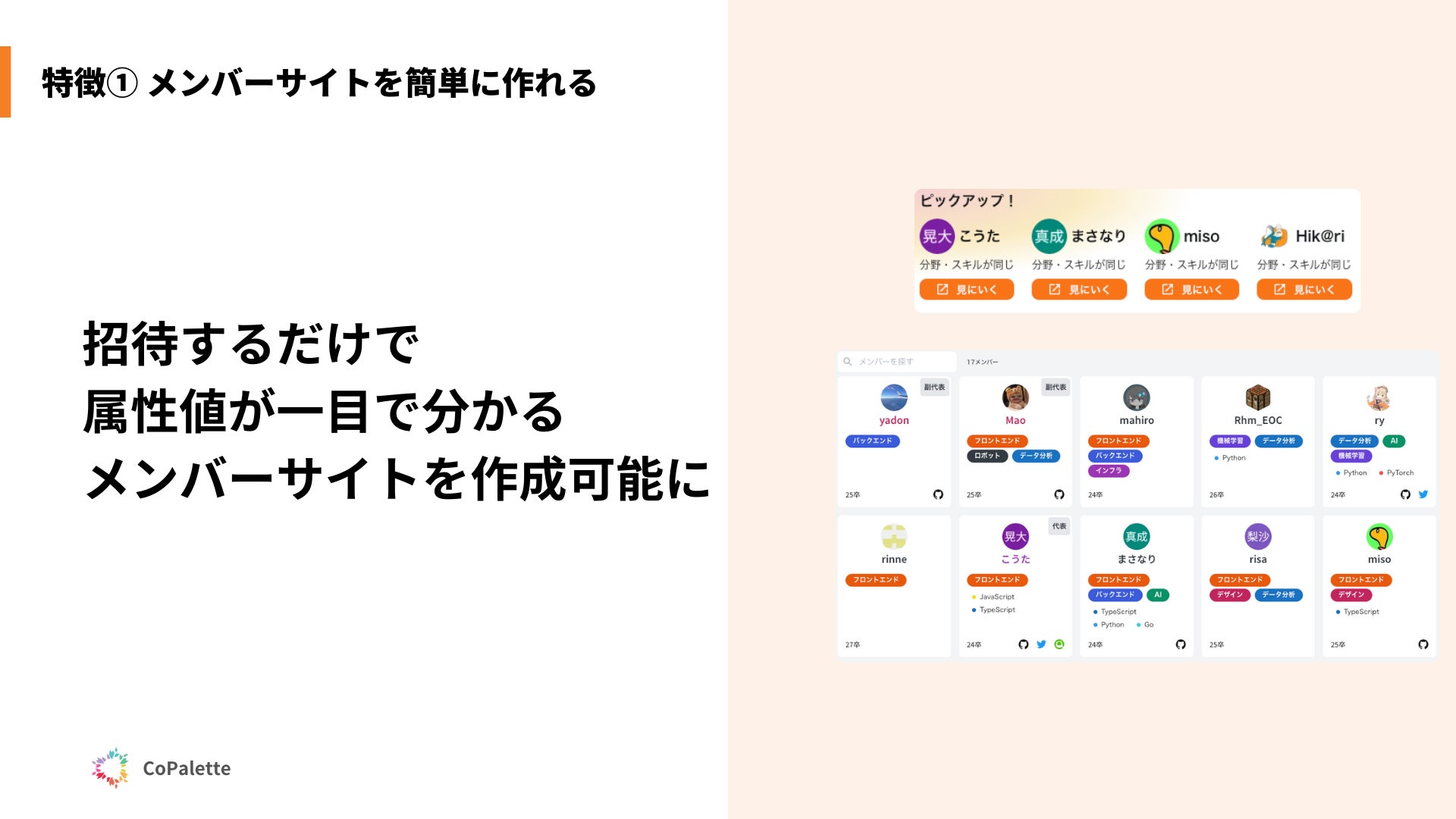 招待するだけで属性値が一目でわかるメンバーサイトを作成可能です