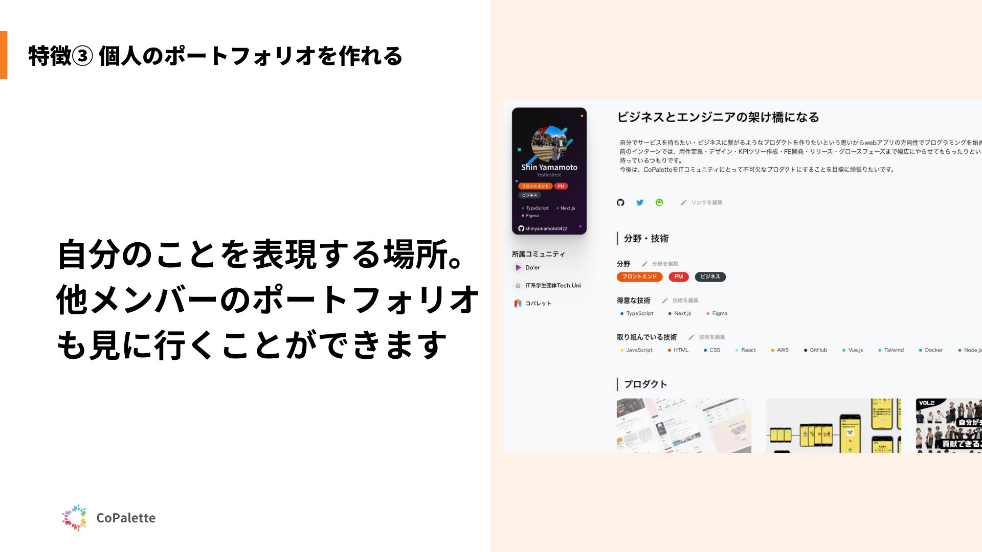 自分のことを表現する場所として、ポートフォリオを作成できるようにしました。自分のコミュニティ内の他メンバーのポートフォリオも見にいくことできます。