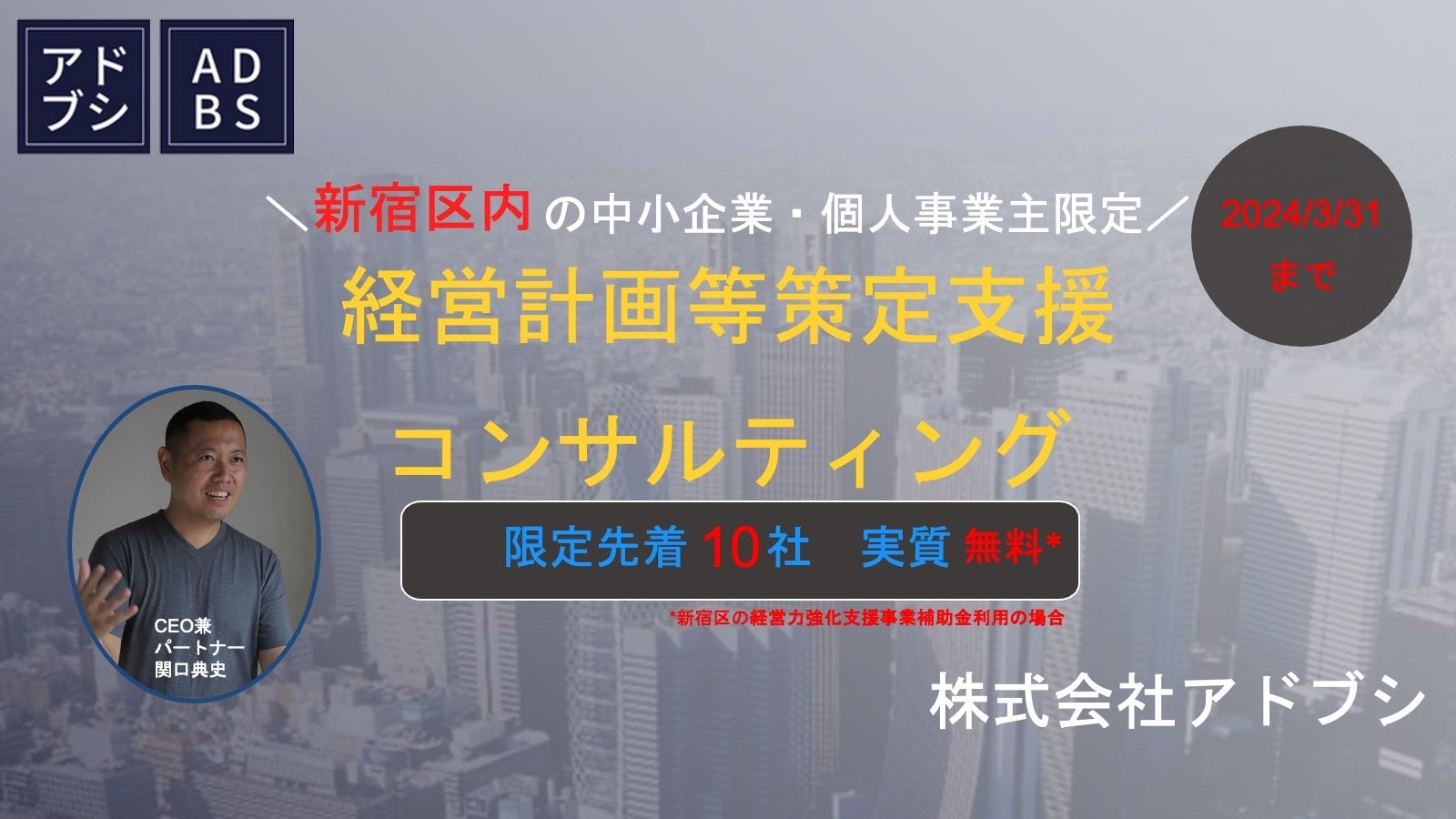 中規模企業/BtoB向け総合広告代理業を展開する株式会社アドブシ[所在地:東京都新宿区、代表取締役CEO:関口 典史]は、期間限定(2024年3月31日まで)で新宿区内の中小企業・個人事業主を対象に、経営計画策定等の支援を行います。
