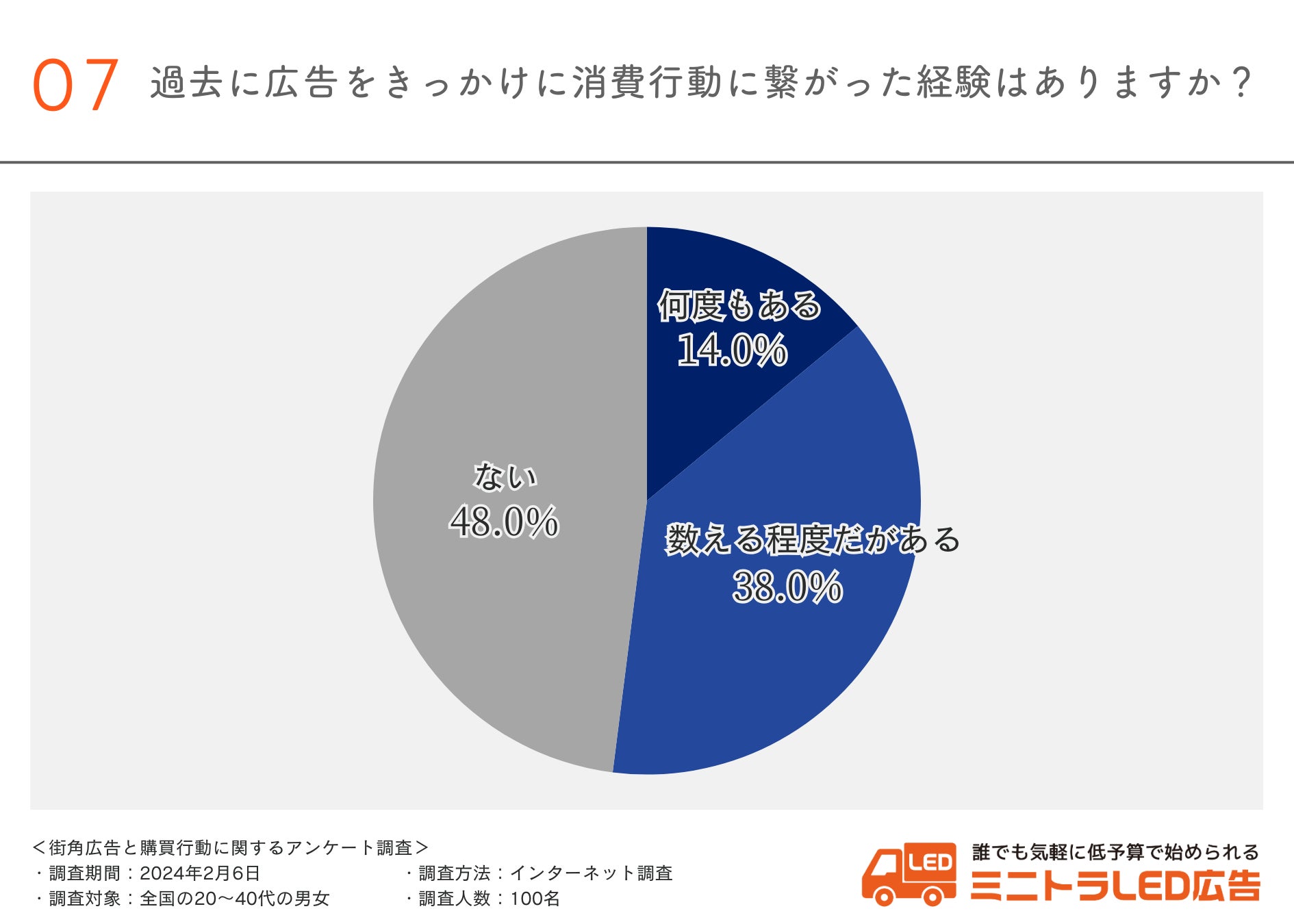 最後に、過去、広告をきっかけに消費行動に繋がった経験があるか伺ったところ、「数える程度だがある(38.0%)」「何度もある(14.0%)」という回答が集まりました。